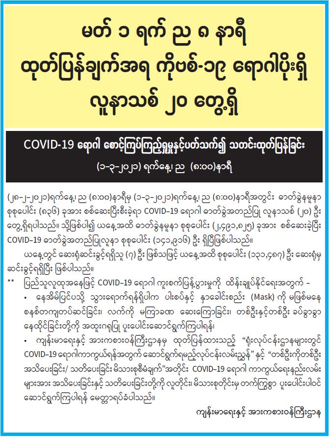 မတ် ၁ ရက် ည ၈ နာရီ ထုတ်ပြန်ချက်အရ ကိုဗစ်-၁၉ ရောဂါပိုးရှိ လူနာသစ် ၂၀ တွေ့ရှိ