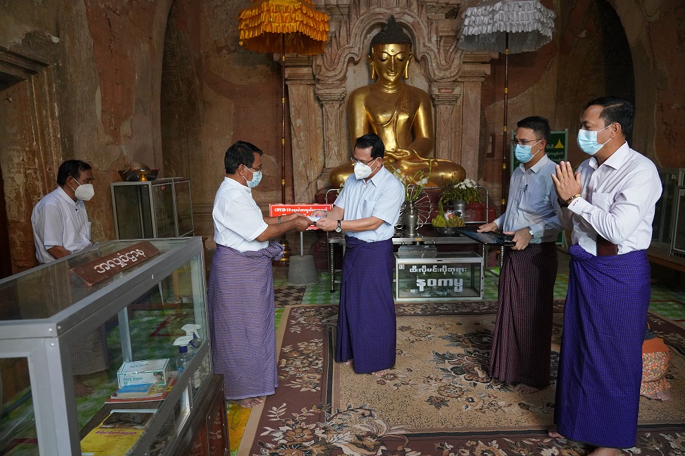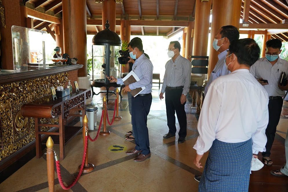 မွန်းလွဲပိုင်းတွင် ပြည်ထောင်စုဝန်ကြီးနှင့်အဖွဲ့သည် ကိုဗစ်-၁၉ တားဆီးကာကွယ်ရေးဆိုင်ရာ သတ်မှတ်စည်းမျဉ်းစည်းကမ်းချက်များနှင့်အညီ ဖွင့်လှစ်ထားရှိသည့် Heritage Bagan Hotel အား ကြည့်ရှုစစ်ဆေးပြီးနောက် Aureum Palace Resort သို့သွားရောက်ကာ ဧည့်သည် များအား Check In နှင့် Menu ဖတ်ရှုနိုင်သည့် ဝန်ဆောင်မှု ကို QR Code စနစ်ဖြင့် ဆောင်ရွက်ပေးနိုင်မှု၊ Royal Palace Hotel နှင့် Tharabar Hotel မှ ကိုဗစ်-၁၉ တားဆီး ကာကွယ်ရေးဆိုင်ရာ သတ်မှတ်စည်းမျဉ်း စည်းကမ်းချက်များနှင့်အညီ ပြန်လည်ဖွင့် လှစ်ရန် ဆောင်ရွက်ထားရှိမှုများကို ကြည့်ရှုစစ်ဆေးသည်။