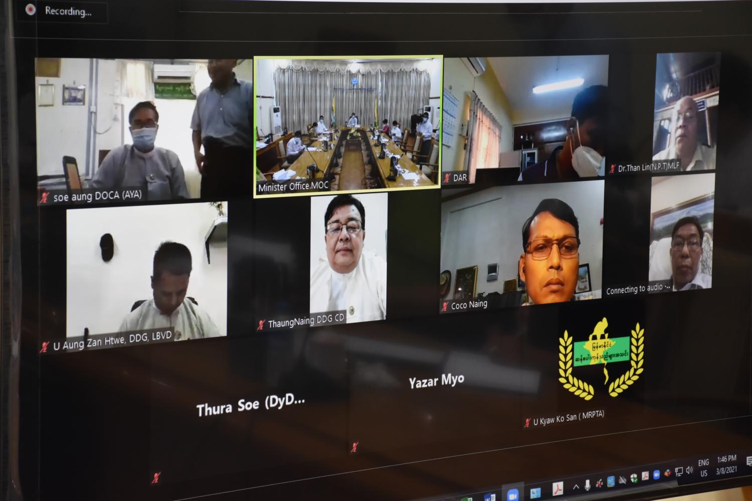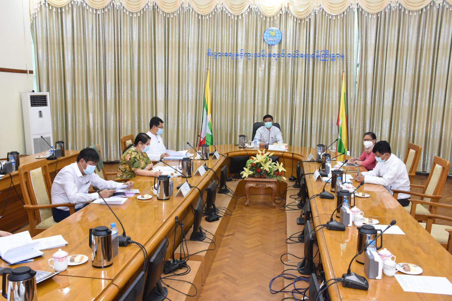 ၂၀၂၀-၂၀၂၁ ဘဏ္ဍာနှစ်အတွင်း အခြေခံရည်ညွှန်းစပါးဈေးနှုန်းဖြင့် ဆန်၊ စပါး ဝယ်ယူခြင်း ဆိုင်ရာကိစ္စရပ်များ အဆင်ပြေချောမွေ့စေရေးအတွက် လယ်ယာထုတ်ကုန်စီမံ ခန့်ခွဲရေးအဖွဲ့ညှိနှိုင်း အစည်းအဝေးကို ယနေ့မွန်းလွဲ ၁ နာရီခွဲတွင် စီးပွားရေးနှင့် ကူးသန်း ရောင်းဝယ်ရေးဝန်ကြီးဌာန၊ အစည်းအဝေးခန်းမ (၁) ၌ Virtual စနစ်ဖြင့် ကျင်းပသည်။