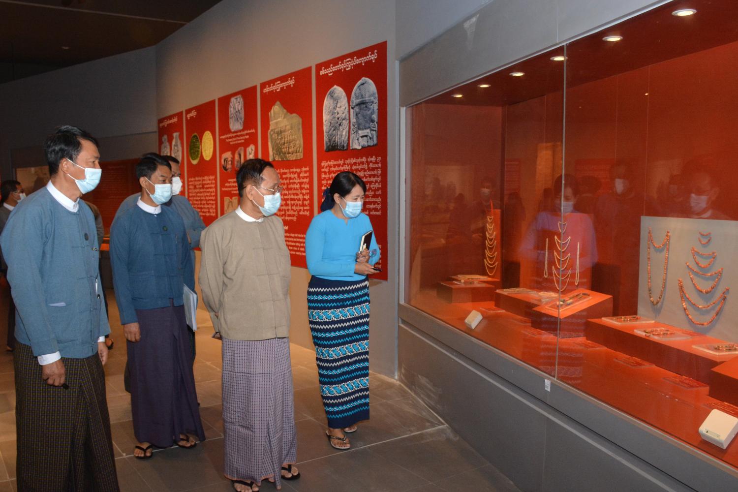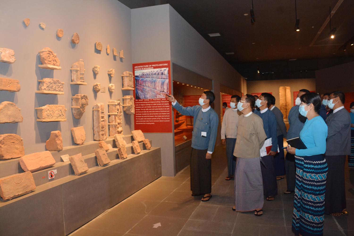 ထို့နောက် ပြည်ထောင်စုဝန်ကြီးသည် အမျိုးသားပြတိုက်(နေပြည်တော်)ရှိ လက်ဆောင် ပစ္စည်း များပြခန်း၊ ပရိုင်းမိတ်နှင့်ကျောက်ဖြစ်ရုပ်ကြွင်းပြခန်း၊ သမိုင်းမတင်မီ ခေတ်(ကျောက်ခေတ်၊ ကြေးခတ်၊ သံခေတ်)ပြခန်း၊ သမိုင်းတင်ခေတ်ဦး( ဘီစီ ၂ ရာစုမှ အေဒီ ၁၀ ရာစု )ပြခန်း၊ သမိုင်း တင်ခေတ်( အေဒီ ၁၁ ရာစုမှ အေဒီ ၁၄ ရာစု )ပြခန်း၊ မြန်မာ့အနုသုခုမပြခန်း၊ မြန်မာ့ပန်းချီပြခန်း၊ သီဟာသနပလ္လင်ပြခန်း၊ မြန်မာ့လက်မှု အနုပညာပြခန်းနှင့် အာဆီယံပြခန်းအတွင်း လှည့်လည် ကြည့်ရှုစစ်ဆေးရာ ရှေးဟောင်း သုတေသနနှင့် အမျိုးသားပြတိုက်ဦးစီးဌာန ညွှန်ကြားရေး မှူးချုပ်က လိုက်လံရှင်းလင်း ပြသသည်။