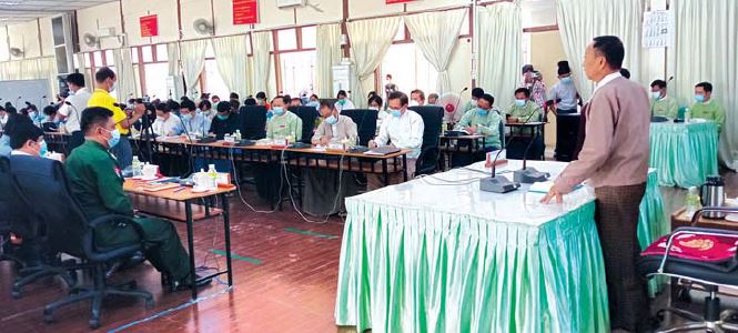 ဧရာဝတီတိုင်းဒေသကြီး စီမံအုပ်ချုပ်ရေးကောင်စီနှင့် တိုင်းဒေသကြီးအဆင့် ဌာနဆိုင်ရာများ တွေ့ဆုံသည့် လုပ်ငန်းညှိနှိုင်း အစည်းအဝေး(၂/၂၀၂၁)ကို မတ် ၁၉ ရက်က ပုသိမ်မြို့ရှိ ဧရာရွှေဝါ ခန်းမ၌ ကျင်းပသည်။