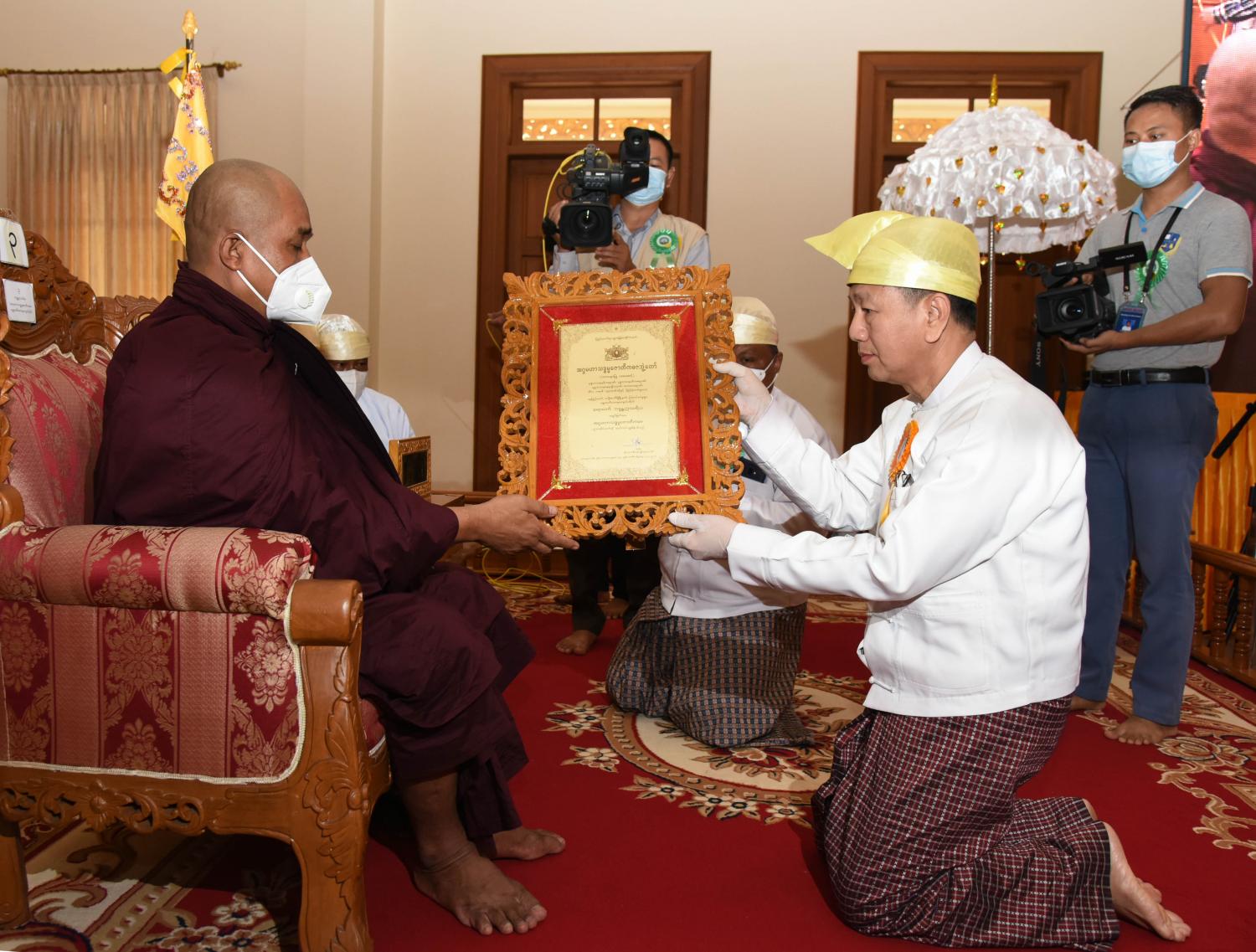 ဆက်လက်၍ နေပြည်တော်ကောင်စီဝင်များ၊ နေပြည်တော် ဒုတိယမြို့တော်ဝန်၊ အမြဲတမ်း အတွင်းဝန်များ၊ ညွှန်ကြားရေးမှူးချုပ်များနှင့် တာဝန်ရှိသူများက အဂ္ဂမဟာသဒ္ဓမ္မ ဇောတိကဓဇ၊ အဂ္ဂမဟာဂန္ထဝါ စကပဏ္ဍိတ၊ မဟာဂန္ထဝါစက ပဏ္ဍိတ၊ မဟာသဒ္ဓမ္မဇောတိကဓဇ၊ မဟာကမ္မဋ္ဌာ နာစရိယ၊ ဓမ္မကထိက ဗဟုဇနဟိတဓရ၊ ဂန္ထဝါ စကပဏ္ဍိတနှင့် သဒ္ဓမ္မ ဇောတိကဓဇ ဘွဲ့တံဆိပ်တော်ရ ဆရာတော်ကြီးများ၊ သီလရှင်ဆရာကြီးများ၊ လူပုဂ္ဂိုလ်တို့အား ဘွဲ့တံဆိပ်တော်နှင့် အဆောင်အယောင်များ ဆက်ကပ်ပူဇော်ပေးအပ်ကြသည်။