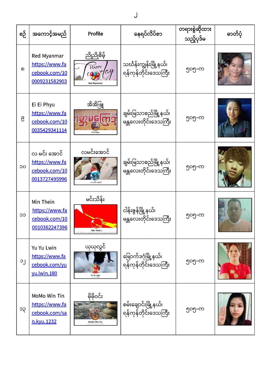 နိုင်ငံတော်၏ အုပ်ချုပ်မှုယန္တရားပျက်ပြားစေရန်ရည်ရွက်ချက်ဖြင့် နိုင်ငံ့ဝန်ထမ်းများအား CDM လှုပ်ရှားမှုတွင် ပါဝင်စေရန်လှုံ့ဆော်ခြင်း၊ CRPH မတရားအသင်းအား ထောက်ခံသည့် အကြောင်းအရာများ၊ မမှန်သတင်းများအားဖြန့်ဝေခြင်း၊ နိုင်ငံတော်တည်ငြိမ်အေးချမ်းမှုကို ပျက်ပြားစေပြီး ဆူပူအုံကြွမှုဖြစ်ပေါ်စေရန်နှင့် အများပြည်သူအထိတ်တလန့်ဖြစ်စေရန် အတွက် သွေးထိုးလှုံ့ဆော်မှုများပြုလုပ်ခြင်း၊ Social Pumishment ပြုလုပ်ခြင်းများကို လူမှုကွန်ရက် စာမျက်နှာများတွင် ရည်ရွယ်ချက်ရှိရှိ ဖြင့်ဖော်ပြခြင်းနှင့် ဖြန့်ဝေခြင်းများ ဆောင်ရွက် လျက်ရှိသည့် အောက်ဖော်ပြပါ အနုပညာရှင်အချို့နှင့် အခြားပါဝင်ပတ်သက်သူများအား ရာဇသတ်ကြီးပုဒ်မ ၅၀၅-က ဖြင့် အမှုဖွင့်အရေးယူ ဆောင်ရွက်လျက်ရှိပါသည်။ သတင်းစဉ်