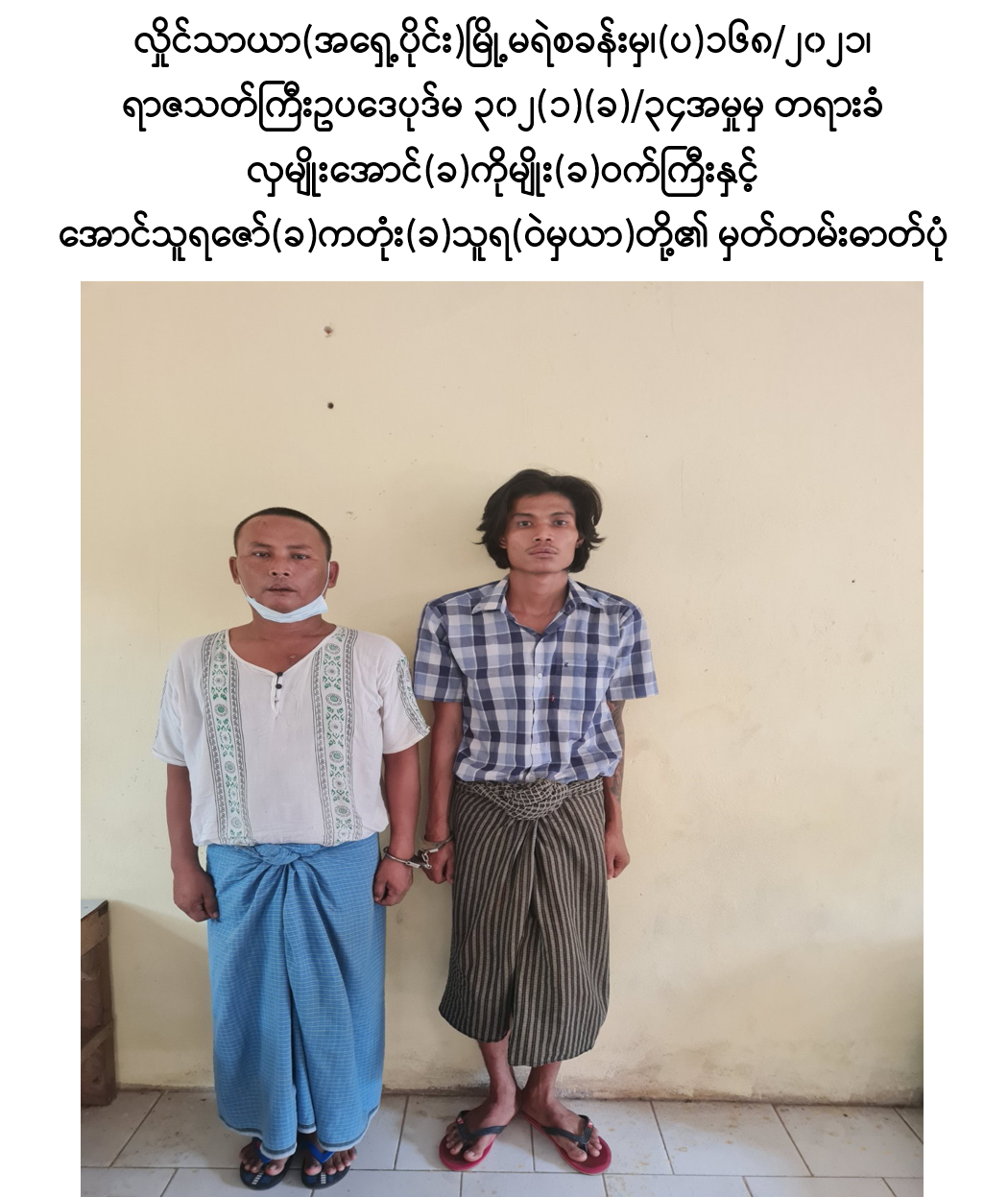 အဆိုပါပြစ်ဒဏ်ချမှတ်ခံရသူ ၂၆ ဦးအနက် အညာသား(ခ)မျိုးဇော်ထက်(ဘ) ဦးဝင်းခိုင်၊ မင်းခန့်(ခ)နှင်းကိုကို(ဘ)ဦးသောင်းတင်၊ ဒေါ်တင်တင်အေး(ဘ)ဦးငွေငြိမ်း၊ ဖိုးသဲ(ဘ)စိစစ်ဆဲ၊ အောင်နိုင်ကို(ဘ)စိစစ်ဆဲ၊ ယဉ်ထွေး(ဘ)စိစစ်ဆဲ၊ ဒေါ်ခင်မာဌေး (ဘ)စိစစ်ဆဲ၊ မပွင့်(ဘ)စိစစ်ဆဲ၊ မင်းမင်း(ခ)အောင်မင်းဦး(ဘ)ဦအုန်းလွင်၊ မြင့်ဦး (ဘ)စိစစ်ဆဲ၊ သန့်ဇင်(ဘ)စိစစ်ဆဲ၊ လှရီ(ဘ)စိစစ်ဆဲ၊ ကြည်လွင်(ဘ)ဦးအောင်လှိုင်၊ ဂျပန်ကြီး(ခ)ထွန်းထွန်းအောင်(ခ)ဘိုထွန်း(ဘ)ဦးသန်းရွှေ၊ ဖိုးကျော်(ခ)ကျော်ကြီး(ခ) ကျော်ကျော်လတ်(ဘ)ဦးမောင်မြင့်၊ သန့်ဇော်ဦး(ခ)သက်ဇော်ဦး(ဘ)ဦးဝင်းလှိုင်နှင့် ဥက္ကာ(ဘ)စိစစ်ဆဲ တို့သည် ထွက်ပြေးလွတ်မြောက်နေသဖြင့် ၎င်းနှင့်စပ်လျဉ်း၍ ရာဇဝတ်ကျင့်ထုံးဥပဒေပုဒ်မ-၈၇၊ ၈၈ အရ ဖမ်းဝရမ်းထုတ်ဆင့်ရန် အမိန့်ချမှတ်ခဲ့ သည်။