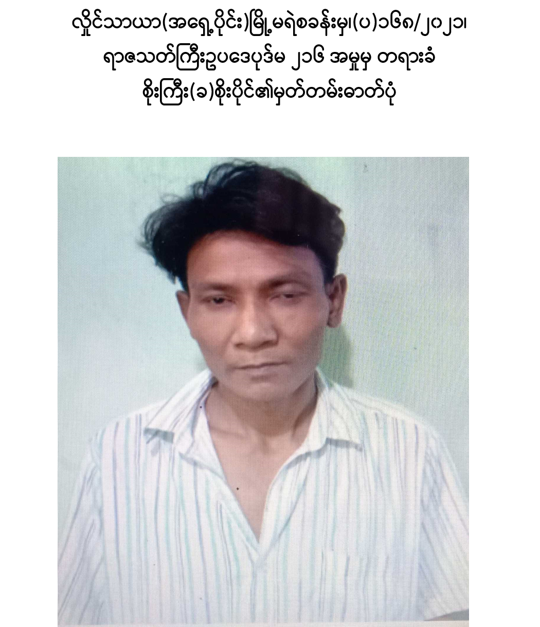 ရန်ကုန်တိုင်းဒေသကြီး၊ လှိုင်သာယာ(အရှေ့ပိုင်း)မြို့နယ်၊ အမှတ်(၇)ရက်ကွက်၊ အောင်မေတ္တာလမ်းနေ မဝင်းသန္တာဆွေ အား မတ် ၁၅ ရက်တွင် လှမျိုးအောင်(ခ) ကိုမျိုး(ခ)ဝက်ကြီး(ဘ)ဦးမြင့်လှိုင်၊ အောင်သူရဇော်(ခ)ကတုံး(ခ)သူရ(ဘ)ဦးအောင်ဇော်ဦး၊ အညာသား(ခ)မျိုးဇော်ထက်(ဘ)ဦးဝင်းခိုင်နှင့် မင်းခန့်(ခ)နှင်းကိုကို(ဘ)ဦးသောင်းတင် တို့သည် အရိုး/အသွား (၉)လက်မခန့်ရှိ ဓားဦးချွန်ဖြင် ထိုးခဲ့သဖြင့် အဆိုပါ မဝင်းသန္တာဆွေတွင် ၄ cm ခန့်အနက်ရှိ ယာရင်အုံထိုးသွင်းဒဏ်ရာ (၂)ချက်၊ ၁၂ cm ခန့်အနက်ရှိ ဝဲရင်အုံထိုးသွင်းဒဏ်ရာ (၄)ချက်၊ ၁၂ cm ဝဲခါးစောင်း ထိုးသွင်းဒဏ်ရာ များ ရရှိခဲ့ပြီး ဝဲရင်အုံးထိုးသွင်းဒဏ်ရာမှာ အဆုတ်ထိရောက်ပြီး ရင်ခေါင်းအတွင်း သွေးယို၍ သေဆုံး ခဲ့ခြင်းဖြင့် တစ်ဦးထက်ပိုသောသူမျာက အကြံတူတစ်ခုကို အထမြောက်စေရန် ပြုလုပ်သည်ခဲ့ သည့်ပြစ်မှုကို ကျူးလွန်ခဲ့သည့်အတွက် စစ်အုပ်ချုပ် ရေး (Martial Law)စစ်ခုံရုံးဖွဲ့၍ စစ်ဆေးမှုများ ဆောင်ရွက်ခဲ့ရာ ရာဇသတ်ကြီး ပုဒ်မ-၃၀၂ (၁)(ခ)/၃၄ အရ ဧပြီ ၁၂ ရက်တွင် “ သေဒဏ် ” အမိန့်ကို လည်းကောင်း၊ တင်ထွန်းအောင်(ခ)မိုးလျှံ(ဘ)ဦးထွန်းဆန်း၊ ဒေါ်မြင့်မြင့်အေး(ဘ)ဦးငွေငြိမ်း နှင့် ဒေါ်တင်တင်အေး(ဘ)ဦးငွေငြိမ်းတို့သည် မဝင်းသန္တာဆွေ အား မတ် ၁၅ ရက်တွင် လှမျိုးအောင်(ခ)ကိုမျိုး(ခ)ဝက်ကြီးနှင့် အောင်သူရဇော်(ခ)ကတုံး(ခ)သူရ တို့က အရိုး/ အသွား (၉)လက်မခန့်ရှိ ဓားဦးချွန်ဖြင် ထိုးခဲ့သဖြင့် သေဆုံးမှုဖြစ်စဉ်တွင် မဝင်းသန္တာဆွေ အား သူလျှို၊ ဒလန်၊ သတင်းပေးဟု စွပ်စွဲကာ သောင်ကြီး ဘုန်းကြီးကျောင်းသို့ ခေါ်ယူစစ်ဆေးမေးမြန်းခြင်း၊ မဝင်းသန္တဆွေ၏ နေအိမ်အား အပြင်ဘက်မှသော့ပိတ်ကာ သော့နှင့် လက်ကိုင်ဖုန်း(၂)လုံးအား သိမ်းဆည်းထား ရှိခဲ့ခြင်း၊ လှမျိုးအောင်(ခ)ကိုမျိုး(ခ)ဝက်ကြီး မှ မဝင်းသန္တာဆေွ အား ခေါ်ဆောင်သွား ရန် သော့အား လာရောက်တောင်းယူစဉ် ပေးအပ်ခဲ့ခြင်းဖြင့် မဝင်းသန္တာဆွေ အား သတ်ရန် အားပေးကူညီမှုကို ပြုလုပ်ခဲ့သည့် ပြစ်မှုကို ကျူးလွန်ခဲ့သည့်အတွက် စစ်အုပ်ချုပ်ရေး (Martial Law)စစ်ခုံရုံးဖွဲ့၍ စစ်ဆေးမှုများ ဆောင်ရွက်ခဲ့ရာ ရာဇသတ်ကြီး ပုဒ်မ-၃၀၂ (၁)(ခ)/၁၀၉ အရ ဧပြီ ၁၂ ရက်တွင် “ သေဒဏ် ”အမိန့်ကို လည်းကောင်း၊ စိုးကြီး(ခ)စိုးပိုင်(ဘ)ဦးလှစော သည် ဧရာဝတီတိုင်းဒေသကြီး၊ ကျောင်းကုန်းမြို့၌ မတ် ၁၆ ရက်နေ့ ည ၈ နာရီအချိန်ခန့်တွင် လှမျိုးအောင်(ခ) ကိုမျိုး(ခ)ဝက်ကြီးနှင့် မကြူကြူသင်း တို့အား လှိုင်သာယာ(အရှေ့ပိုင်း)မြို့နယ်၊ အမှတ်(၇)ရပ်ကွက်၊ အောင်မေတ္တာလမ်းနေ မဝင်းသန္တာဆွေ အား လူသတ်မှုကျူးလွန်ခဲ့သဖြင့် ဖမ်းဆီးစေရန် အမိန့်ထုတ်ပြန်ထားပြီး ထွက်ပြေးနေသည်ကို သိလျက်နှင့် ဖမ်းဆီးခြင်းမှ ကာကွယ်ရန်အကြံဖြင့် လက်သင့်ခံမှုကို ပြုလုပ်ခဲ့သည့် ပြစ်မှု