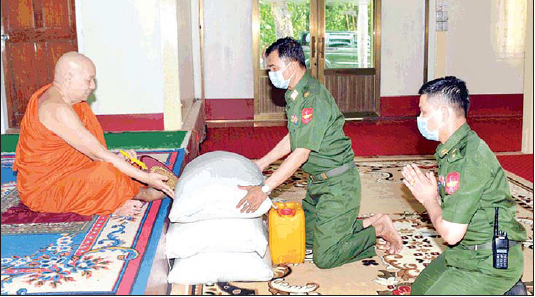 ဘုန်းတော်ကြီး ကျောင်းများ၊ သာသနာ့နွယ်ဝင် သီလရှင် ကျောင်းများနှင့် ဘာသာရေး ကျောင်းများတွင် ဆွမ်းအဆင်ပြေ စေရေးအတွက် တပ်မတော် (ကြည်း၊ ရေ၊ လေ) အရာရှိ၊ စစ်သည်၊ အရာထမ်း၊ အမှုထမ်း များက တိုင်းစစ်ဌာနချုပ်များ၊ အလိုက် မြို့နယ်အသီးသီး၌ ဆွမ်းဆန်တော်၊ ဆီ၊ ဆား၊ ပဲ အမယ်လေးမျိုးနှင့်လှူဖွယ်ပစ္စည်း များ လှူဒါန်းခြင်း၊ နေ့ဆွမ်းများ ဆက်ကပ် လှူဒါန်းခြင်းနှင့် ကျန်းမာရေး စစ်ဆေးမှုများကို ဆောင်ရွက်လျက်ရှိသည်။