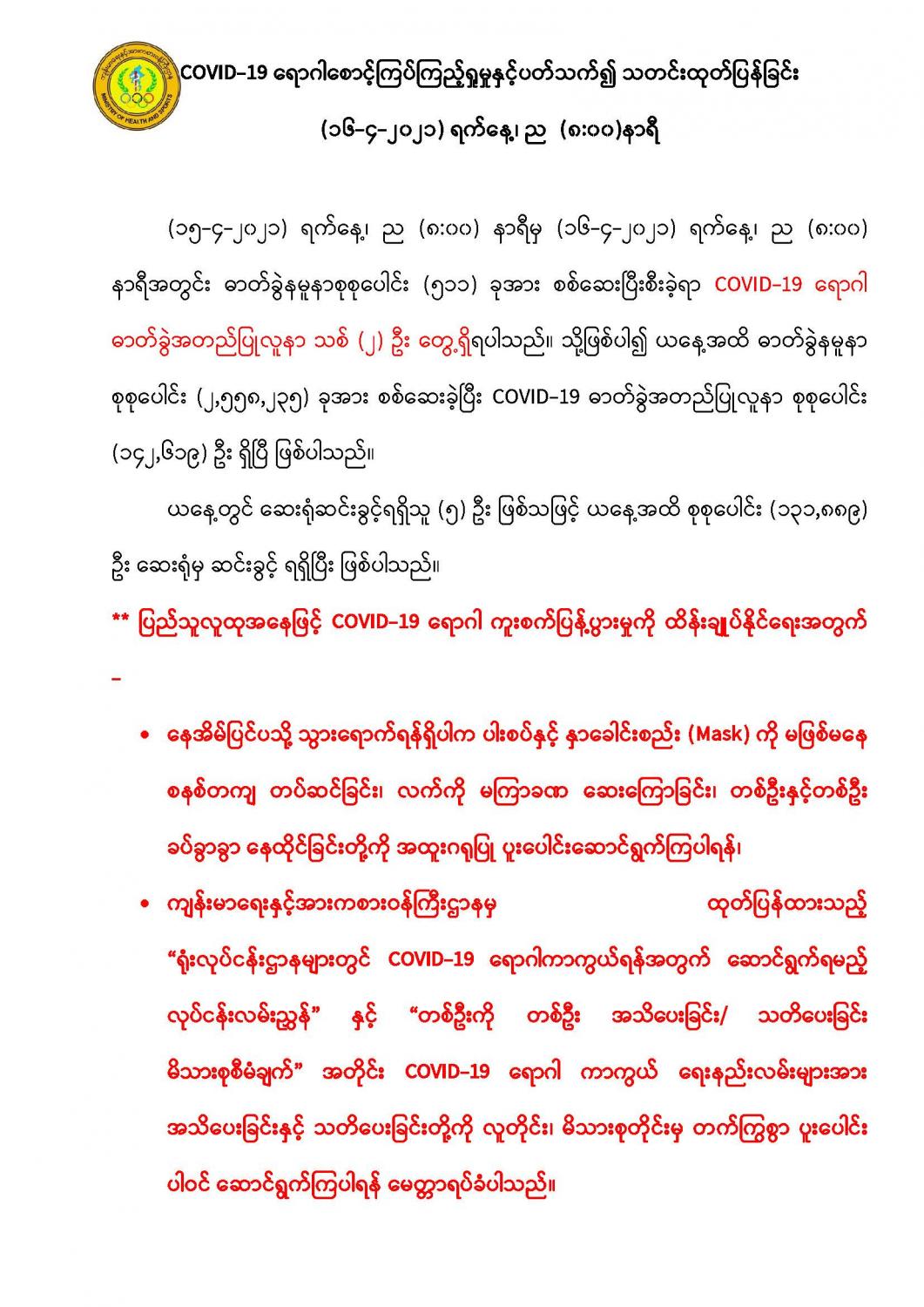 COVID-19 ရောဂါစောင့်ကြပ်ကြည့်ရှုမှုနှင့်ပတ်သက်၍ သတင်းထုတ်ပြန်ခြင်း (၁၆-၄-၂၀၂၁) ရက်နေ့၊ ည (၈:၀၀)နာရီ