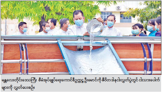 ယင်းနောက် ဆရာတော် သံဃာတော်များအား တိုင်းဒေသ ကြီး စီမံအုပ်ချုပ်ရေးကောင်စီ ဥက္ကဋ္ဌနှင့် အဖွဲ့ဝင်များကလှူဖွယ် ဝတ္ထုပစ္စည်းများနှင့် နဝကမ္မ အလှူငွေများ ဆက်ကပ်လှူဒါန်းကြပြီး စံပယ်ရုံ မိုးကုတ်ရိပ်သာ ပဓာနနာယကထံမှ အနုမောဒနာရေစက်ချတရား နာယူကြည်ညို ကြကာလှူဒါန်းမှု အစုစုတို့ အတွက် ရေစက်သွန်းလောင်း အမျှပေးဝေ ကြသည်။