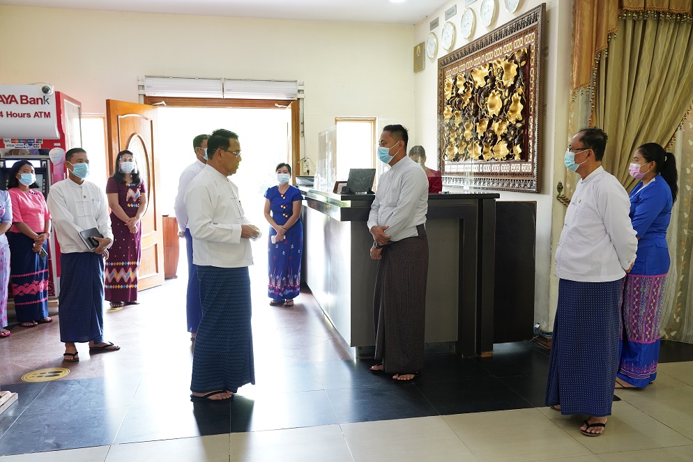 ထို့နောက် ပြည်ထောင်စုဝန်ကြီးသည် ကိုဗစ်-၁၉ ကာကွယ်ရေးဆိုင်ရာ သတ်မှတ်စည်းမျဉ်း စည်းကမ်းများနှင့်အညီ ဖွင့်လှစ်ထားရှိသည့် ဟိုတယ်များကို သွားရောက် ကြည့်ရှုစစ်ဆေးရာ တာဝန်ရှိသူများက ဟိုတယ်ဆိုင်ရာ ကိစ္စရပ်များနှင့် ဧည့်သည်များကို ဝန်ဆောင်မှု ပေးနေသည့်အခြေအနေများ ရှင်းလင်းတင်ပြပြီး ပြည်ထောင်စုဝန်ကြီးက နေပြည်တော်သည် အစိုးရရုံးစိုက်ရာ မြို့တော်ဖြစ်သည့်အတွက် လုပ်ငန်းဆောင်ရွက်ရာတွင် ကိုဗစ်-၁၉ ရောဂါ ဂရုပြုရန်လိုအပ်ပါကြောင်း။