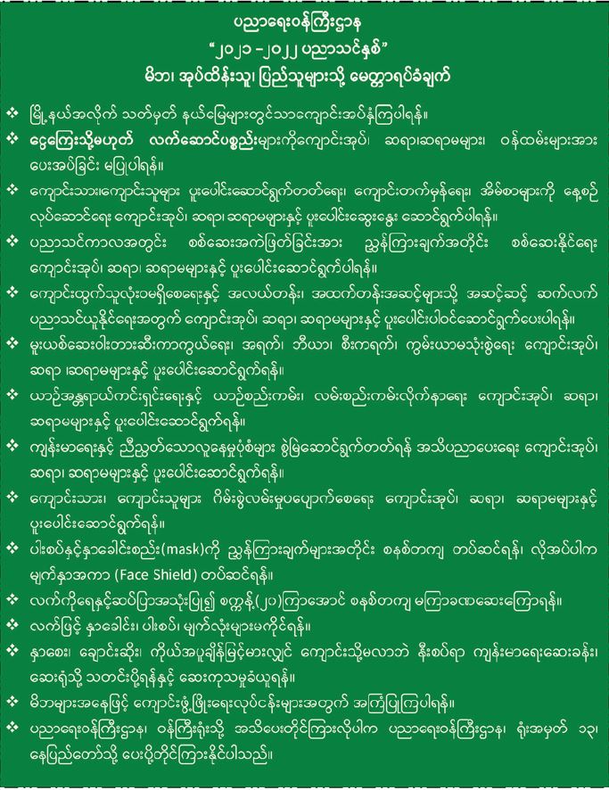 ပညာရေးဝန်ကြီးဌာန “၂၀၂၁-၂၀၂၂ ပညာသင်နှစ်” မိဘ၊ အုပ်ထိန်းသူ၊ ပြည်သူများသို့ မေတ္တာရပ်ခံချက်