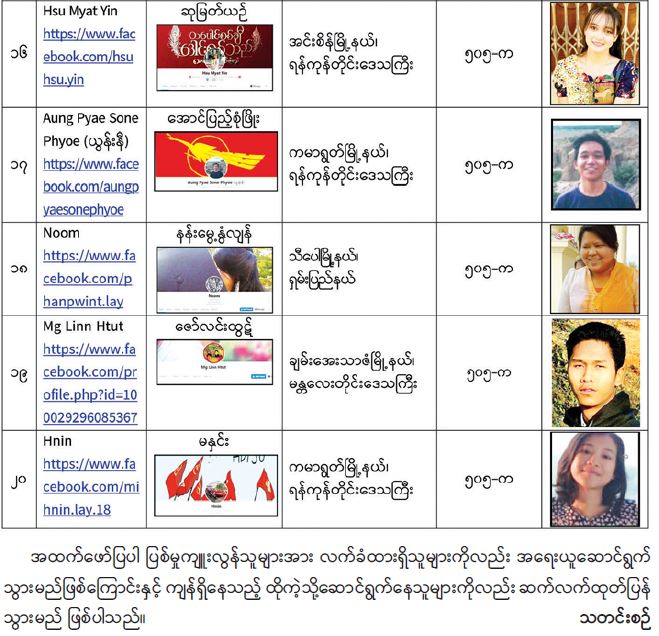 လူမှုကွန်ရက်အားအသုံးပြု၍ နိုင်ငံတော်တည်ငြိမ်အေးချမ်းမှုကို ပျက်ပြားစေရန် ရည်ရွယ်ချက်ဖြင့် လှုံ့ဆော်ခဲ့သည့် တက္ကသိုလ်/ကောလိပ်ကျောင်းများရှိ ကျောင်းသားသမဂ္ဂ အဖွဲ့ဝင်များအား ၅၀၅-က ဖြင့် အမှုဖွင့်အရေးယူဆောင်ရွက်