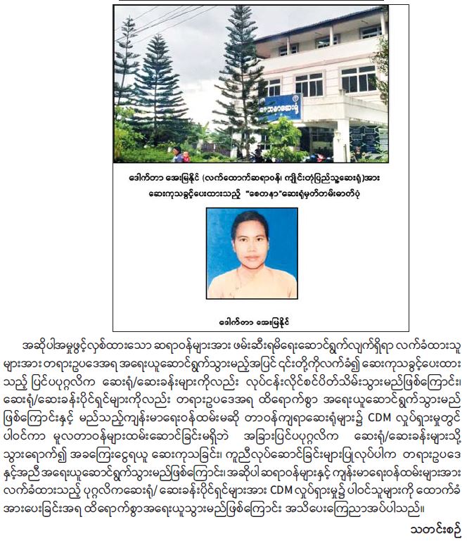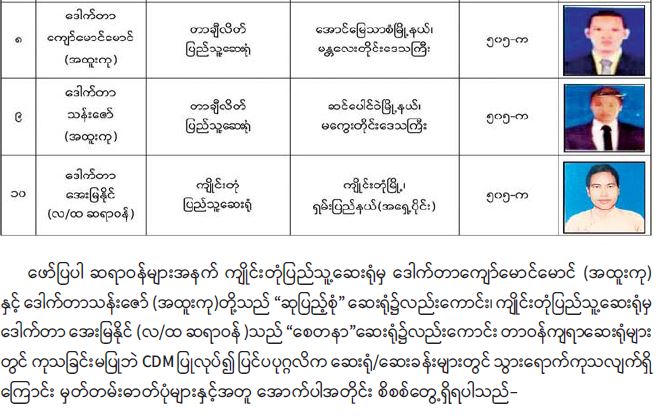 နိုင်ငံတော်တည်ငြိမ်အေးချမ်းမှုကို ပျက်ပြားစေရန်ရည်ရွယ်ချက်ဖြင့် CDM လှုပ်ရှားမှုတွင် ပါဝင်သည့် ဆရာဝန်များအား ရာဇသတ်ကြီးပုဒ်မ ၅၀၅-က ဖြင့် အမှုဖွင့်အရေးယူ ဆောင်ရွက်(၇-၅-၂၀၂၁) 05/08/2021