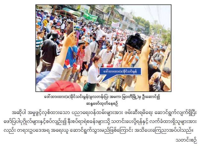နိုင်ငံတော်တည်ငြိမ်အေးချမ်းမှုကို ပျက်ပြားစေရန်ရည်ရွယ်ချက်ဖြင့် CDM လှုပ်ရှားမှုတွင် ပါဝင်သည့်ပညာရေးဝန်ထမ်းများအား ရာဇသတ်ကြီးဥပဒေပုဒ်မ ၅၀၅-က ဖြင့် အမှုဖွင့် အရေးယူဆောင်ရွက်(၇-၅-၂၀၂၁)