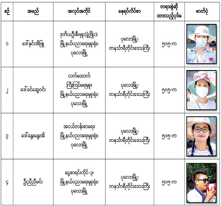 အဆိုပါ အမှုဖွင့်လှစ်ထားသော ပညာရေးဝန်ထမ်းများအား ဖမ်းဆီးရမိရေး ဆောင်ရွက်လျက်ရှိပြီး ဖော်ပြပါ ပုဂ္ဂိုလ်များ နှင့်စပ်လျဉ်း၍ နီးစပ်ရာရဲစခန်းများသို့ သတင်းပေးပို့ရန်နှင့် လက်ခံထားရှိသူများ အားလည်း တရားဥပဒေအရ အရေး ယူဆောင်ရွက်သွားမည်ဖြစ်ကြောင်း အသိပေးကြေညာအပ်ပါသည်။
