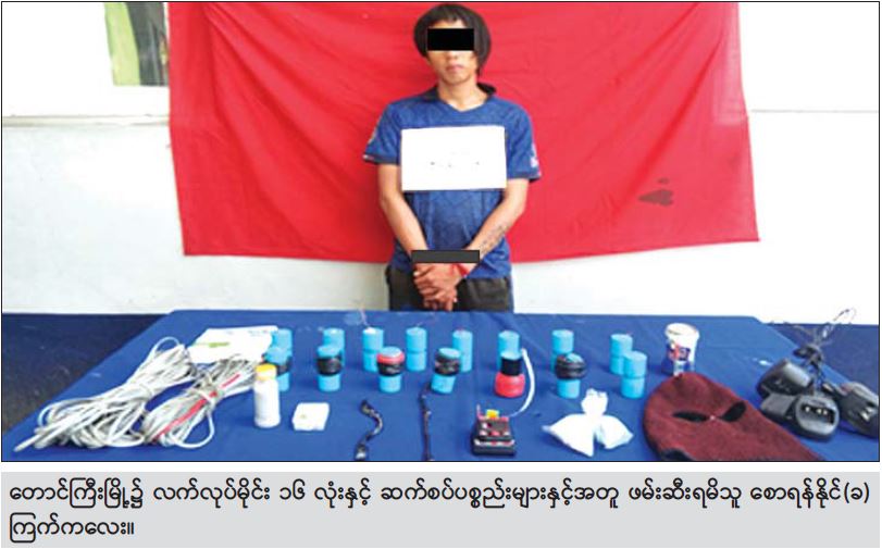 ထိုသို့ ဆောင်ရွက်ခဲ့ရာတွင် မေလ ၉ ရက်နေ့ နံနက် ၁၁ နာရီအချိန်တွင် တနင်္သာရီတိုင်း ဒေသကြီး၊ ကျွန်းစုမြို့နယ်၊ ပင်ပွားအော်ကျေးရွာနေ ရဲစက်အောင်(ခ)သံပူလ (၃၀)နှစ်(ဘ) ဦးစံရွှေ၏ နေအိမ်မှ တူမီးသေနတ် ၁ လက်အား လည်းကောင်း၊ နံနက် ၁၁ နာရီအချိန်တွင် ရှမ်းပြည်နယ်(အရှေ့ပိုင်း)၊ တာချီလိတ်မြို့ ဝိန်းကျောင်းရပ်ကွက်နေ မဝင်းဝင်းနွယ်(၃၇)နှစ် (ဘ)ဦးချန်ဖုပိုင်ဆိုင် သည့် “ချစ်ကြိုးသွယ်” ပစ္စည်းအရောင်းဆိုင်အတွင်းမှ ၎င်းအား ဗြောက်အိုး၊ မီးရှူး၊ မီးပန်းများမျိုးစုံ ၄၁ မျိုးနှင့် လည်းကောင်း၊ နေ့လယ် ၁၂ နာရီအချိန်တွင် မယ်ခေါင် ရပ်ကွက်နေ မနန်းကျန်ရှဲန် (၄၄)နှစ် (ဘ)ဦးနန်ဆိုင်၏ “သင်္ဃန်းပရိက္ခရာ”ဆိုင်အတွင်းမှ ၎င်းအား ဗြောက်အိုး၊ မီးရှူး/မီးပန်း မျိုးစုံ ၁၂ မျိုး နှင့်လည်းကောင်း၊ နေ့လယ် ၁ နာရီအချိန်တွင် ဆန်ဆိုင်း(ခ)ရပ်ကွက်နေ စိုင်းခမ်းနွံ(၃၅)နှစ် (ဘ)ဦးအောင်မြင့်၏ “သင်္ဃန်းပရိက္ခရာ” ဆိုင်အတွင်းမှ ၎င်းအား ဗြောက်အိုး၊ မီးရှူး/မီးပန်းများမျိုးစုံ ၁၂ မျိုးနှင့်လည်းကောင်း ၊ နေ့လယ် ၁၂ နာရီ ၂၀ မိနစ်အချိန်တွင် ရှမ်းပြည်နယ်(တောင်ပိုင်း)၊ တောင်ကြီးမြို့နယ်၊ ကောင်းရွေး ကျေးရွာရှိ နေအိမ် ၁ လုံးအတွင်းမှ PVC ပိုက်ဖြင့် ပြုလုပ်ထားသည့် လက်လုပ်မိုင်း ၁၆ လုံး၊ ယမ်းမှုန့် ၁ ဘူး၊ ပေ ၂၀ ခန့်ရှိ နီနက်ရောင် ဝါယာကြိုးခွေ ၂ ခွေ၊ ကန့်အခဲ ၁ ထုပ်၊ ယမ်းစိမ်း မှုန့် ၁ ထုပ်၊ မျက်နှာဖုံးခေါင်းစွပ် ၁ ခု၊ စကားပြောစက်အားသွင်းခုံ ၄ ခုံနှင့် အခြားဆက်စပ် ပစ္စည်းများအား လည်းကောင်း၊ မွန်းလွဲ ၂ နာရီအချိန်တွင် မန္တလေးတိုင်းဒေသကြီး၊ အောင်မြေသာစံမြို့နယ်၊ ဥပုသ်တော်ရပ်ကွက်၊ “ရွှေမန်းတောင်”ဂေါက်ကွင်းအနီး၌ သေနတ် ၁ လက်အားလည်ကောင်း၊၊