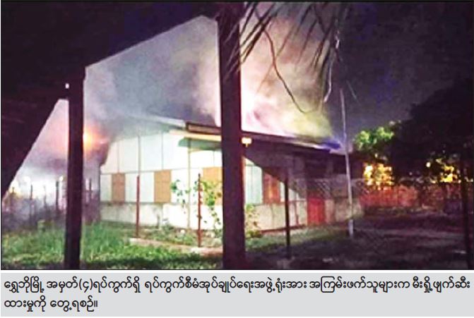 ထိုသို့ လုပ်ဆောင်ရာတွင် မေ ၁၃ ရက် နံနက် ၃ နာရီတွင် စစ်ကိုင်းတိုင်းဒေသကြီး ရွှေဘိုမြို့ အမှတ်(၄)ရပ်ကွက် ကျီတော်စုရပ်ရှိ ရပ်ကွက်စီမံအုပ်ချုပ်ရေးအဖွဲ့ရုံးအား အကြမ်းဖက်သူများက မီးရှို့ဖျက်ဆီးခဲ့၍ မီးလောင်မှု ဖြစ်ပွားကြောင်း သတင်းအရ လုံခြုံရေး တပ်ဖွဲ့ဝင်များနှင့် မီးသတ်တပ်ဖွဲ့ဝင်များက သွားရောက်မီးငြှိမ်းသတ်ခဲ့ရာ ၂၅ မိနစ်ခန့် အကြာတွင် မီးငြိမ်း သွားခဲ့ပြီး မီးလောင်မှုကြောင့် အဆိုပါရုံးနောက်တွင် အဖီဆွဲထားသော သွပ်မိုး၊ ထရံကာ၊ အုတ်ခင်းအခန်း တစ်ခန်းနှင့် အဆိုပါ အခန်းအတွင်းမှ စားပွဲခုံနှစ်လုံး၊ သေတ္တာလေးလုံးနှင့် အရန်မီးသတ်ဝတ်စုံများ မီးလောင်ပျက်စီး ဆုံးရှုံးခဲ့ကြောင်း သိရသည်။