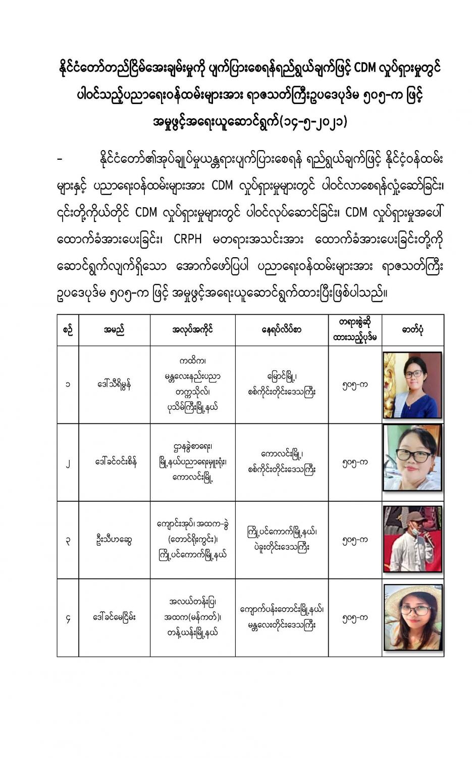 နိုင်ငံတော်တည်ငြိမ်အေးချမ်းမှုကို ပျက်ပြားစေရန်ရည်ရွယ်ချက်ဖြင့် CDM လှုပ်ရှားမှုတွင် ပါဝင်သည့်ပညာရေးဝန်ထမ်းများအား ရာဇသတ်ကြီးဥပဒေပုဒ်မ ၅၀၅-က ဖြင့် အမှုဖွင့်အရေးယူဆောင်ရွက်(၁၄-၅-၂၀၂၁) 05/14/2021