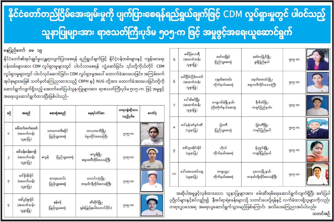 နိုင်ငံတော်တည်ငြိမ်အေးချမ်းမှုကို ပျက်ပြားစေရန် ရည်ရွယ်ချက်ဖြင့် CDM လှုပ်ရှားမှုတွင် ပါဝင်သည့် သူနာပြုများအား ရာဇသတ်ကြီးပုဒ်မ ၅၀၅-က ဖြင့် အမှုဖွင့်အရေးယူ ဆောင်ရွက် (၁၉-၅-၂၀၂၁) 05/20/2021