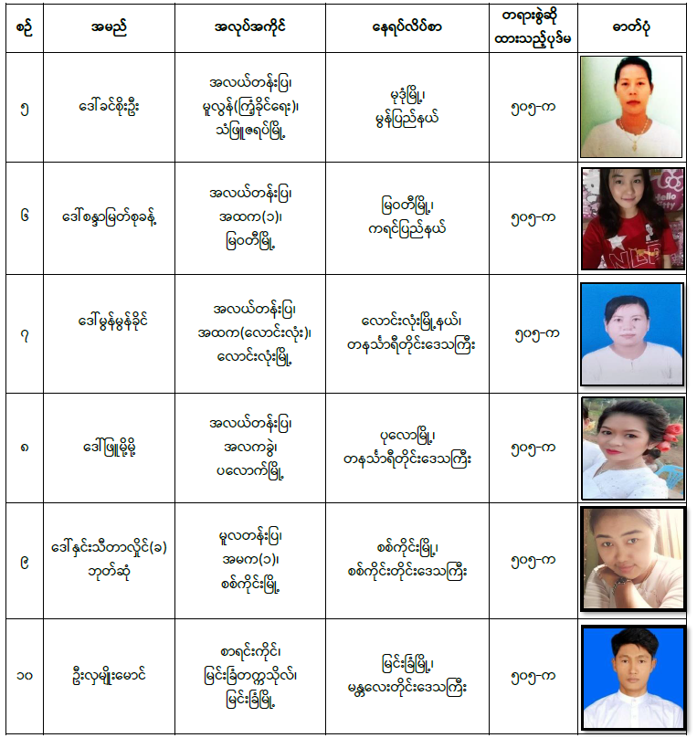 - အဆိုပါ အမှုဖွင့်လှစ်ထားသော ပညာရေးဝန်ထမ်းများအား ဖမ်းဆီးရမိရေး ဆောင်ရွက်လျက်ရှိပြီး ဖော်ပြပါပုဂ္ဂိုလ်များနှင့်စပ်လျဉ်း၍ နီးစပ်ရာရဲစခန်းများသို့ သတင်း ပေးပို့ရန်နှင့် လက်ခံထားရှိသူများကိုလည်း တရားဥပဒေအရ အရေးယူဆောင်ရွက် သွားမည်ဖြစ်ကြောင်း အသိပေးကြေညာအပ်ပါသည်။