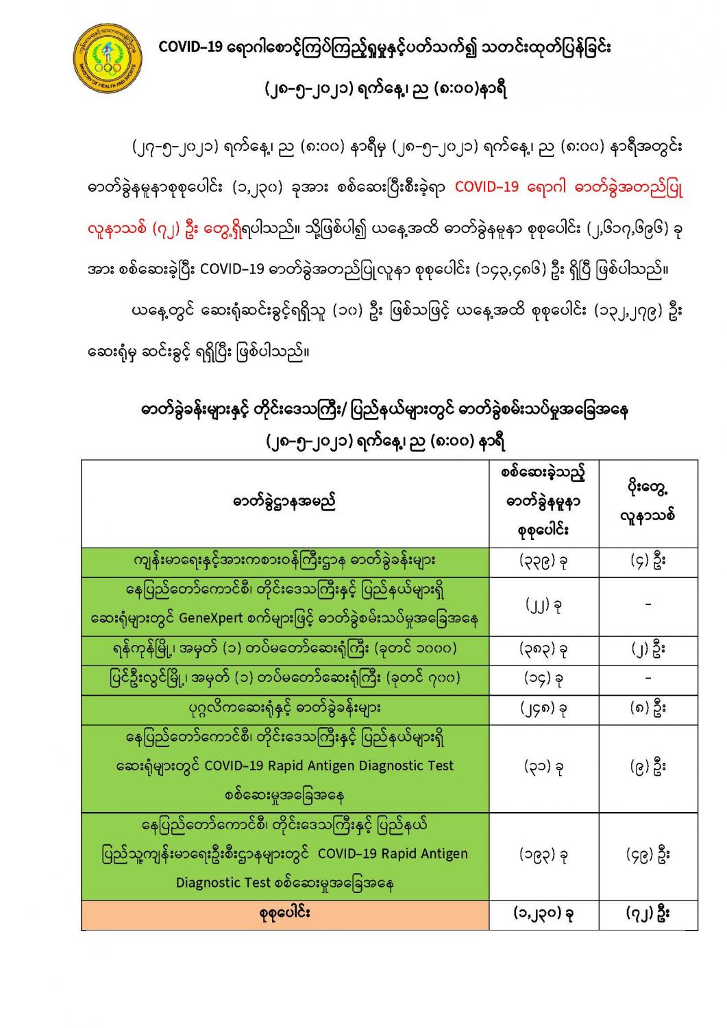 COVID-19 ရောဂါစောင့်ကြပ်ကြည့်ရှုမှုနှင့်ပတ်သက်၍ သတင်းထုတ်ပြန်ခြင်း (၂၈-၅-၂၀၂၁) ရက်နေ့၊ ည (၈:၀၀)နာရီ 05/28/2021