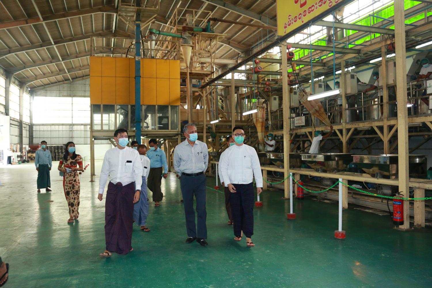 ရှေးဦးစွာ ကုမ္ပဏီ၏ ဒါရိုက်တာ ဉီးကောင်းခန့်ဇင်က လုပ်ငန်းဆောင်ရွက်နေမှုများနှင့် ရင်းနှီးမြှုပ်နှံမှုဆိုင်ရာကိစ္စရပ်တို့နှင့်စပ်လျဉ်း၍ ရှင်းလင်းတင်ပြရာ ပြည်ထောင်စုဝန်ကြီးက ကုန်ထုတ်လုပ်မှု မြှင့်တင်ရေး၊ ပြည်ပသို့ တန်ဖိုးမြှင့် နှမ်းတိုးမြှင့်တင်ပို့နိုင် ရေးကိစ္စတို့နှင့် စပ်လျဉ်း၍ ဆွေးနွေးပြောကြားပြီး လိုအပ်သည်များ ဆွေးနွေးပေါင်းစပ် ညှိနှိုင်းပေးကာ စက်ရုံအတွင်း လှည့်လည်ကြည့်ရှု အားပေးသည်။