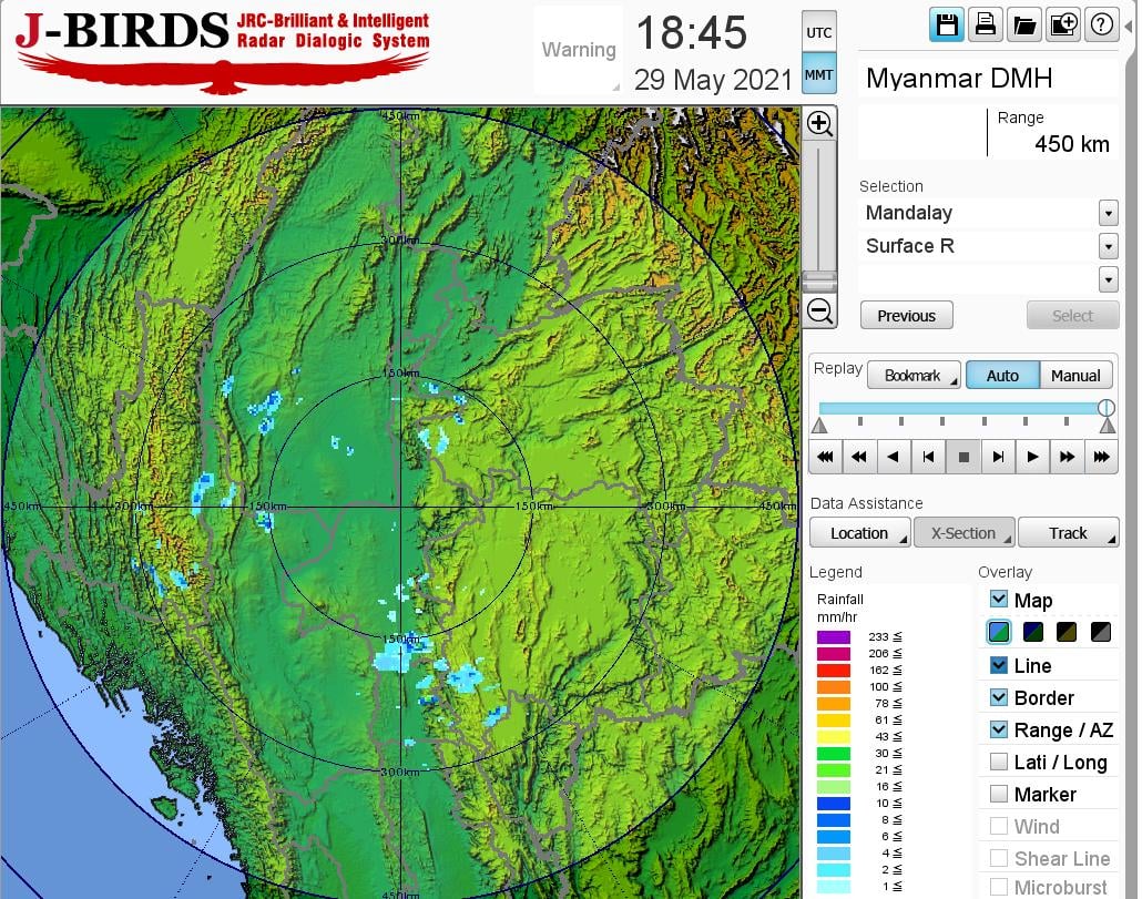 မနက်ဖြန် မွန်းတည့်ချိန်အထိ ခန့်မှန်းချက်။ တနင်္သာရီတိုင်းဒေသကြီး၊ ရှမ်းပြည်နယ် (တောင်ပိုင်းနှင့် အရှေ့ပိုင်း)၊ ကရင်ပြည်နယ်နှင့် မွန်ပြည်နယ်တို့တွင် နေရာအနှံ့အပြား၊ ပဲခူးတိုင်း ဒေသကြီး၊ ရန်ကုန်တိုင်းဒေသကြီး၊ ဧရာဝတီတိုင်းဒေသကြီးနှင့် ကယားပြည်နယ်တို့တွင် နေရာစိပ်စိပ်၊ နေပြည်တော်၊ မန္တလေးတိုင်းဒေသကြီး၊ ကချင်ပြည်နယ်နှင့် ချင်းပြည်နယ်တို့တွင် နေရာကျဲကျဲနှင့် ကျန်တိုင်းဒေသကြီးနှင့် ပြည်နယ်တို့တွင် နေရာ ကွက်ကျား မိုးထစ်ချုန်းရွာပြီး၊ ရန်ကုန်တိုင်းဒေသကြီးနှင့် တနင်္သာရီတိုင်းဒေသကြီးတို့တွင် နေရာကွက်၍ မိုးကြီးနိုင်ပါသည်။ ရွာရန်ရာနှုန်း (၈၀) ဖြစ်ပါသည်။