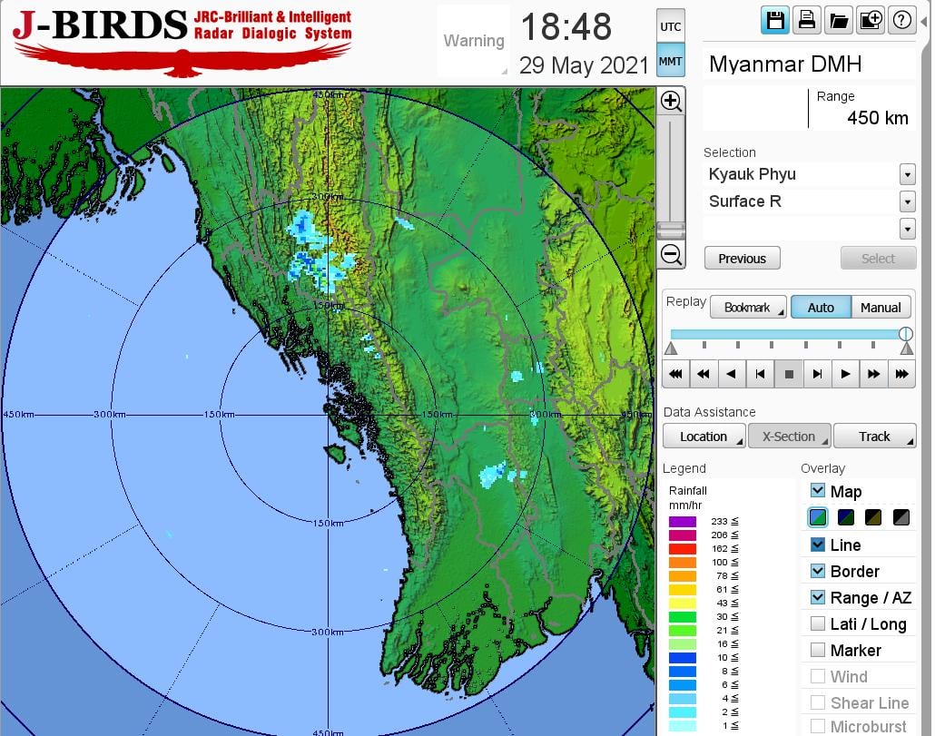 ဘင်္ဂလားပင်လယ်အော်အခြေအနေ။ကပ္ပလီပင်လယ်ပြင်၊ ဘင်္ဂလားပင်လယ်အော်တောင်ပိုင်းနှင့် အရှေ့အလယ်ပိုင်းတို့တွင် မုတ်သုံလေ အားအသင့်အတင့်မှ အားကောင်းနေပြီး၊ ကျန်ဘင်္ဂလားပင်လယ်အော်တွင် တိမ်အနည်းငယ်ဖြစ်ထွန်းနေပါသည်။