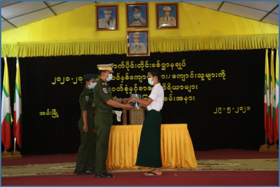 ထို့နောက် တိုင်းမှူးနှင့် တာဝန်ရှိ သူများက ကျောင်းဝတ်စုံနှင့် ကျောင်းသုံးစာရေးကိရိယာများ ထောက်ပံ့ပေးအပ်ပြီး တိုင်းမှူးနှင့် အဖွဲ့ဝင်များက ကျောင်းသား၊ ကျောင်းသူများ၊ ကျောင်းသားမိဘ များနှင့် ဆရာ၊ ဆရာမများအား ရင်းရင်းနှီးနှီးတွေ့ဆုံနှုတ်ဆက်သည်။ အလားတူ တိုင်းစစ်ဌာနချုပ် ကွပ်ကဲမှုအောက် တပ်ရင်း/တပ်ဖွဲ့ များတွင်လည်း ကျောင်းဝတ်စုံနှင့် စာရေးကိရိယာများ ထောက်ပံ့ပေးအပ်ခြင်းများကို တာဝန်ရှိသူများက ထောက်ပံ့ဆောင်ရွက်ပေးခဲ့ကြောင်း သတင်းရရှိသည်။