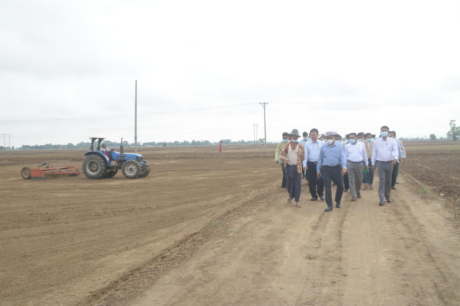 စိုက်ပျိုးရေး၊ မွေးမြူရေးနှင့် ဆည်မြောင်းဝန်ကြီးဌာန ဒုတိယဝန်ကြီး ဒေါက်တာ အောင်ကြီးသည် မေ ၂၉ ရက် နံနက်ပိုင်းက ရေတာရှည်မြို့နယ် သပြေတန်းကျေးရွာအုပ်စု၌ စက်မှုလယ်ယာစနစ်ကျ လယ်ယာမြေဖော်ထုတ်ခြင်းလုပ်ငန်းခွင်ကို ကြည့်ရှုစစ်ဆေးသည်။