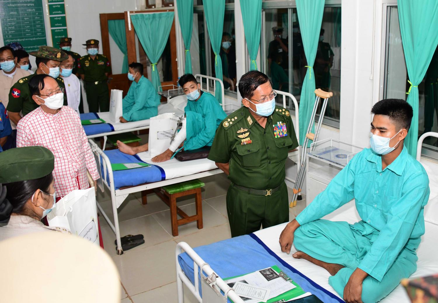 ထို့ပြင် နိုင်ငံတော်စီမံအုပ်ချုပ်ရေးကောင်စီဥက္ကဋ္ဌ တပ်မတော်ကာကွယ်ရေး ဦးစီးချုပ်၊ ဇနီးနှင့် အဖွဲ့ဝင်များသည် မော်လမြိုင်မြို့ရှိ နယ်မြေခံတပ်မတော်ဆေးရုံသို့ သွား ရောက်ကြည့်ရှုစစ်ဆေးပြီး ဆေးရုံတက်ရောက် ကုသမှုခံယူလျက်ရှိသည့် အရာရှိ၊ စစ်သည်၊ မိသားစုများနှင့် ဒေသခံပြည်သူများအား ရင်းရင်းနှီးနှီး အားပေးစကားပြောကြားပြီး စားသောက်ဖွယ်ရာများ ပေးအပ်သည်။ ပြည်နယ်ပြည်သူ့ဆေးရုံကြီးတွင် ကျန်းမာရေးဝန်ထမ်းများ လုပ်ငန်းတာဝန်ပျက်ကွက်မှုများကြောင့် တပ်မတော်ဆေးရုံ၌ ဖေဖော်ဝါရီလမှ ယနေ့အထိ ရိုးရိုးမီးဖွားလူနာ ၅၄၀ ဦး၊ ခွဲစိတ်မီးဖွားလူနာ ၃၀၉ ဦး၊ အကြီးစားခွဲစိတ်လူနာ ၄၈၅ ဦး၊ ပုံမှန်ခွဲစိတ်လူနာ ၄၉၆ ဦးအပါအဝင် စုစုပေါင်း ဆေးရုံတက်အရပ်သားလူနာ ၄၂၆၅ ဦးကို လက်ခံကုသပေးနိုင်ခဲ့ကြောင်းနှင့် လက်ရှိတွင်လည်း အရပ်သားလူနာ ၅၂ ဦးကို လက်ခံကုသပေးလျက်ရှိကြောင်း သတင်းရရှိ သည်။