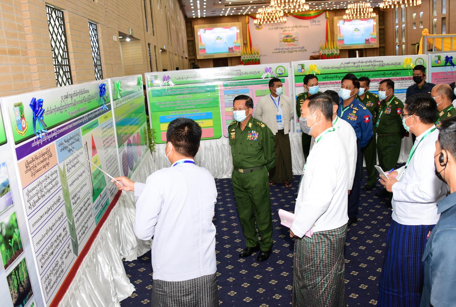 ထို့နောက် နိုင်ငံတော်စီမံအုပ်ချုပ်ရေးကောင်စီဥက္ကဋ္ဌ၊ တပ်မတော်ကာကွယ်ရေး ဦးစီးချုပ်နှင့် တက်ရောက်လာကြသူများသည် ကမ္ဘာ့ပတ်ဝန်းကျင် ထိန်းသိမ်းရေးနေ့ အထိမ်းအမှတ်အဖြစ် ပြသထားသည့် ပြခန်းများအားလှည့်လည်ကြည့်ရှုခဲ့ကြကြောင်း သတင်းရရှိသည်။