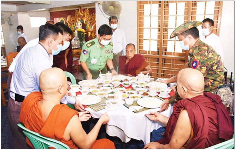 ရခိုင်ပြည်နယ် အမ်းမြို့ ဝဏ္ဏိတာရာမ ပရိယတ္တိစာသင်တိုက်၊ ပုဏ္ဏားကျွန်းမြို့ရှိ မြို့နယ်ခန်းမနှင့် မန္တလေးတိုင်းဒေသကြီး ပြည်ကြီးတံခွန်မြို့နယ်ရှိ မဟာသုန္ဒရာရာမကျောင်းတိုက်တို့၌ အစိုးရပထမပြန်စာမေးပွဲ ဖြေဆိုနေကြသည့် သံဃာတော်များ၊ သာသနာ့နွယ်ဝင်သီလရှင်များနှင့် စာမေးပွဲကြီးကြပ် ဆရာတော်ကြီးများအား ယနေ့တွင် သက်ဆိုင်ရာ တိုင်းစစ်ဌာနချုပ်များမှ တိုင်းမှူးများနှင့် တာဝန်ရှိသူများက သွားရောက်ဖူးမြော်ကြည်ညိုကြ၍ နဝကမ္မအလှူငွေနှင့် လှူဖွယ်ပစ္စည်းများ ဆက်ကပ်လှူဒါန်းပြီး နေ့ဆွမ်းများ ဆက်ကပ် လှူဒါန်းခဲ့ကြကြောင်း သတင်းရရှိသည်။