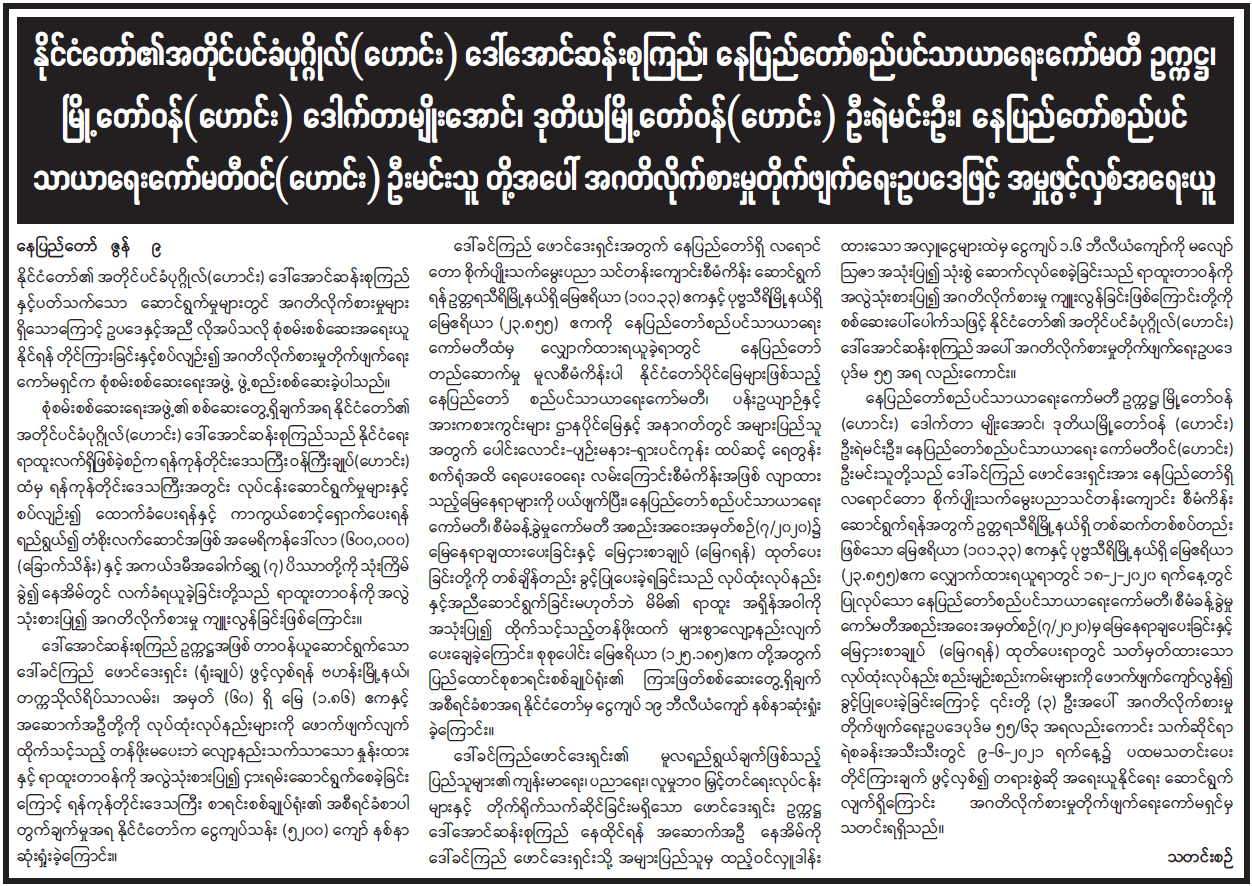 နိုင်ငံတော်၏အတိုင်ပင်ခံပုဂ္ဂိုလ်(ဟောင်း) ဒေါ်အောင်ဆန်းစုကြည်၊ နေပြည်တော်စည်ပင်သာယာရေးကော်မတီ ဥက္ကဋ္ဌ၊ မြို့တော်ဝန်(ဟောင်း) ဒေါက်တာမျိုးအောင်၊ ဒုတိယမြို့တော်ဝန်(ဟောင်း) ဦးရဲမင်းဦး၊ နေပြည်တော်စည်ပင် သာယာရေးကော်မတီဝင်(ဟောင်း) ဦးမင်းသူ တို့အပေါ် အဂတိလိုက်စားမှုတိုက်ဖျက်ရေးဥပဒေဖြင့် အမှုဖွင့်လှစ်အရေးယူ