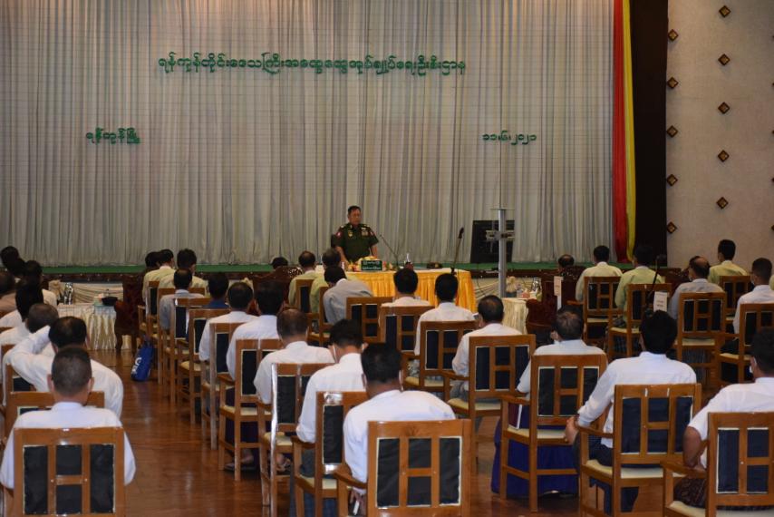 ယင်းနောက် ပြည်ထောင်စုဝန်ကြီးသည် နိုင်ငံတော်စီမံအုပ်ချုပ်ရေးကောင်စီ ပေါ်ပေါက်လာရသည့် အခြေအနေ၊ နိုင်ငံတော်စီမံအုပ်ချုပ်ရေးကောင်စီ၏ ရှေးလုပ်ငန်းစဉ်(၅)ရပ်နှင့် ဦးတည်ချက်(၉)ရပ်ချမှတ် ဆောင်ရွက်နေမှုအခြေအနေ၊ ပြည်ထောင်စုရွေးကောက်ပွဲကော်မရှင်မှ မြို့နယ်အသီးသီးတွင် မဲစာရင်း များအား ဌာနဆိုင်ရာပူးပေါင်းအဖွဲ့အစည်းများဖြင့် ပွင့်လင်းမြင်သာစွာ စစ်ဆေးမှုနှင့် တွေ့ရှိရမှုအခြေ အနေ၊ နိုင်ငံတော် ဆန့်ကျင်ရေးကိုနည်းမျိုးစုံဖြင့် ဆောင်ရွက်နေသည့် အခြေအနေ၊ အစွန်းရောက်အကြမ်းဖက်အဖွဲ့အစည်းများ၏ လုပ်ရပ်မျိုးဖြင့် ပြည်သူလူထုမရွေး၊ နေရာဒေသမရွေးတွင် အဖျက်အမှောက်လုပ်ငန်းများကို ဆောင်ရွက်နေမှုများနှင့် ထိုသို့ဆောင်ရွက်နေမှု များကို ရပ်ကွက်/ ကျေးရွာ အုပ်ချုပ်ရေးမှူးများအနေဖြင့် လုံခြုံရေးအဖွဲ့အစည်းများနှင့်အတူ ပူးပေါင်းဆောင်ရွက်ကြရမည် ဖြစ်ကြောင်း၊ ဝန်ကြီးဌာနမှ သတ်မှတ်ပေးထားသည့် ရပ်ကွက်/ကျေးရွာ အုပ်ချုပ်ရေးမှူးလုပ်ငန်းတာဝန် (၃၂)ချက်ကို ကျေညက်စွာ သိရှိကြပြီး လိုက်နာဆောင်ရွက်ကြရန် လိုအပ်ပါကြောင်း၊ ရပ်ကွက်/ကျေးရွာများတွင် အုပ်ချုပ်ရေးမှူးများ၏ အခန်းကဏ္ဍသည် လူတစ်ဦး မွေးဖွားစဉ်မှ သေဆုံးသွားချိန်အထိ လိုအပ်ချက်နှင့် လုပ်ငန်းရပ်များကိုဆောင်ရွက် ပေးနေရသူအဖြစ် မြင့်မားစွာ ရပ်တည်နေကြသည်ကို ပြည်သူလူထု အနေဖြင့် သိမြင်နားလည်ကြရန် လိုအပ်ပါကြောင်း၊ လက်ရှိအချိန်ကာလအရ မိမိတို့၏တစ်ဦးချင်း လုံခြုံရေး၊ မိမိတာဝန်ယူထားရသည့် ရပ်ကွက်/ ကျေးရွာများ၏လုံခြုံရေးကို တာဝန်ရှိသူ အသီးသီးအနေဖြင့် (ရဲဘော်ရဲဘက်စိတ်)အပြည့်အဝဖြင့် ဆောင်ရွက်ကြရန် လိုအပ်ကြောင်းမှာကြားသည်။