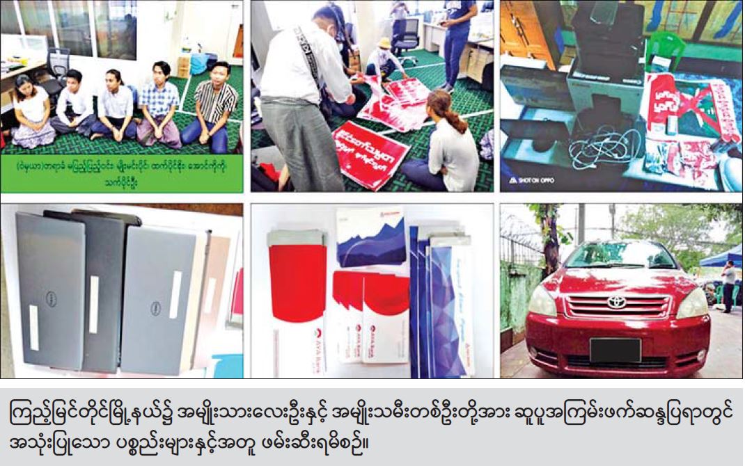 ထိုသို့ဖမ်းဆီးခြင်းများ ဆောင်ရွက်ခဲ့ရာ ဇွန်လ ၁၀ ရက်နေ့ နံနက် ၁၁ နာရီအချိန်တွင် ရန်ကုန်တိုင်းဒေသကြီး၊ ကြည့်မြင်တိုင်မြို့နယ်၊ မကျည်းတန်းမြောက်အရှေ့ရပ်ကွက်၊ စလင်း လမ်း၊ တိုက်(၃)၊ (၆)လွှာ၌ ဆူပူဆန္ဒပြမှု များပြုလုပ်ရန် လူစုနေကြောင်း သတင်းအရ လုံခြုံရေး တပ်ဖွဲ့ဝင်များက သွားရောက်စစ်ဆေးခဲ့ရာ ပုဇွန်တောင်မြို့နယ်၊ ရေကျော်ရပ်ကွက်နေ ထက်ပိုင်စိုး(၂၉)နှစ် (ဘ)ဦးတင်ဝင်းပါ ၅ ဦးနှင့်အတူ ဆူပူဆန္ဒပြရာတွင် အသုံးပြုသည့် ဗွီနိုင်း၊ စာရွက်စာတမ်းနှင့် ဆက်စပ်ပစ္စည်းများ၊ ဘဏ်စာအုပ် ၆ အုပ်၊ ချက်လက်မှတ်စာအုပ် ၆ အုပ်၊ နိုင်ငံခြားငွေနှင့် မြန်မာ ငွေအဝင်အထွက် ဇယား ၃ ရွက်၊ မြန်မာငွေစက္ကူရောရာ ၁,၆၃၂,၅၀၀၊ 5F/xxxx မော်တော်ယာဉ် ၁ စီး တို့အား တွေ့ရှိသိမ်းဆည်းရမိကြောင်း သိရသည်။