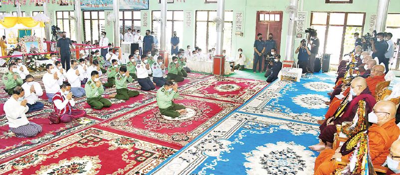 ဦးစွာ နိုင်ငံတော်သံဃမဟာနာယကအဖွဲ့ အကျိုးတော်ဆောင်၊ သန်လျင်မင်းကျောင်း ဆရာတော် အဂ္ဂမဟာပဏ္ဍိတ၊ အဂ္ဂမဟာ သဒ္ဓမ္မဇောတိကဓဇ ဒေါက်တာ ဘဒ္ဒန္တ စန္ဒိမာ ဘိဝံသထံမှ နိုင်ငံတော်စီမံအုပ်ချုပ်ရေးကောင်စီဥက္ကဋ္ဌ တပ်မတော်ကာကွယ်ရေး ဦးစီးချုပ်နှင့် အခမ်းအနား တက်ရောက်လာကြသည့် ဧည့်ပရိသတ်များက ငါးပါးသီလ ခံယူ ဆောက်တည်ကြပြီး နိုင်ငံတော်စီမံအုပ်ချုပ်ရေးကောင်စီဥက္ကဋ္ဌ တပ်မတော် ကာကွယ်ရေးဦးစီးချုပ် ဗိုလ်ချုပ်မှူးကြီး မင်းအောင်လှိုင်၊ နိုင်ငံတော်စီမံအုပ်ချုပ်ရေး ကောင်စီဒုတိယဥက္ကဋ္ဌ ဒုတိယတပ်မတော်ကာကွယ်ရေးဦးစီးချုပ် ကာကွယ်ရေး ဦးစီးချုပ် (ကြည်း) ဒုတိယဗိုလ်ချု်ပမှူးကြီး စိုးဝင်း၊ သာသနာရေးနှင့်ယဉ်ကျေးမှု ဝန်ကြီးဌာန ပြည်ထောင်စုဝန်ကြီး ဦးကိုကိုနှင့် ဥပါသကာများက ဆရာတော်ကြီး၏ ဥတုဇ ရုပ်ကလာပ်တော်အား စိန်ကတ္တီပါလွှမ်း၍ပူဇော်သည်။