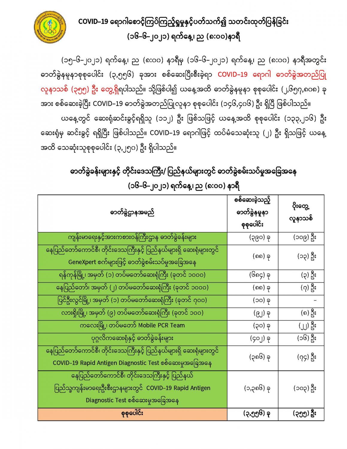 COVID-19 ရောဂါစောင့်ကြပ်ကြည့်ရှုမှုနှင့်ပတ်သက်၍ သတင်းထုတ်ပြန်ခြင်း (၁၆-၆-၂၀၂၁) ရက်နေ့၊ ည (၈:၀၀)နာရီ 06/16/2021