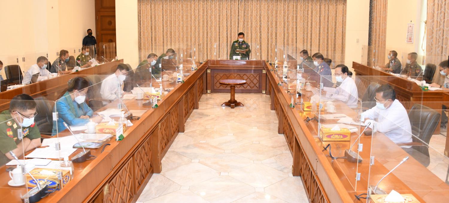 ယင်းနောက် ပြည်ထောင်စုဝန်ကြီးများဖြစ်ကြသည့် ဗိုလ်ချုပ်ကြီးမြထွန်းဦး၊ ဒုတိယဗိုလ်ချုပ်ကြီး ထွန်းထွန်းနောင်၊ ဗိုလ်ချုပ်ကြီးတင်အောင်စန်း၊ ဦးမြင့်ကြိုင်၊ ဒေါက်တာ သက်ခိုင်ဝင်း၊ ဒေါက်တာ သက်သက်ခိုင်၊ ဒုတိယဝန်ကြီး ဦးအေးထွန်းနှင့် ဗိုလ်မှူးချုပ် ကိုကိုလွင်တို့က ကမ္ဘာတွင် COVID-19 ရောဂါဖြစ်ပွားလျက်ရှိသည့် အခြေအနေများနှင့် ရောဂါဖြစ်ပွားမှု မြင့်တက်လျက်ရှိသည့် အခြေအနေများ၊ COVID-19 ရောဂါ ကာကွယ်၊ တားဆီး၊ ထိန်းချုပ်၊ ကုသရေးနှင့် အရေးပေါ်တုံ့ပြန်ရေး လုပ်ငန်းဆောင်ရွက် လျက်ရှိသည့် အခြေအနေများ၊ မြန်မာနိုင်ငံအတွင်း COVID-19 ရောဂါနှင့်စပ်လျဉ်း၍ အလျင်အမြန်တုံ့ပြန်ဆောင်ရွက်သင့်သည့် အခြေအနေများ၊ အလုပ်သမားများနှင့် စက်ရုံအလုပ်ရုံများတွင် COVID-19 ရောဂါ ကာကွယ်တားဆီးရေး လုပ်ငန်းဆောင်ရွက်လျှက်ရှိသည့်အခြေအနေများ၊ တိုင်းဒေသကြီးပြည်နယ်အလိုက် COVID-19 ရောဂါ ဓာတ်ခွဲ အတည်ပြုမှုအခြေအနေများ၊ မြန်မာနိုင်ငံတွင် COVID-19 ရောဂါအစုလိုက်ဖြစ်ပွားမှု အခြေအနေများ၊  အရေးပေါ်တုံ့ပြန်ရေးဆေးအဖွဲ့ ဖွဲ့စည်းဆောင်ရွက်လျက်ရှိသည့်  အခြေ အနေများ၊ COVID-19 ဓာတ်ခွဲစစ်ဆေးခြင်းလုပ်ငန်း တိုးချဲ့ဆောင်ရွက်ခဲ့မှုများ၊ COVID-19  ရောဂါ ဓာတ်ခွဲစစ်ဆေးမှုနည်းပညာအလိုက် ရောဂါပိုးတွေ့ရှိမှု အခြေအနေများ၊ COVID-19 ရောဂါ ဖြစ်ပွားသည့်လူနာများအား ကုသမှုပေးခဲ့သည့် အစီအစဉ်များ၊ COVID-19 ရောဂါ ဖြစ်ပွားမှုအတွက် ပြင်ဆင် ဆောင်ရွက်ထားရှိမှုများ၊ အသွားအလာ ကန့်သတ်ထားရှိမှုများနှင့် ဆက်လက်ဆောင်ရွက်မည့် အခြေအနေများ၊  စေတနာဝန်ထမ်းများနှင့် ပူးပေါင်းဆောင်ရွက်မ များ၊ ကျန်းမာရေး အသိပညာမြှင့်တင်ရေး လုပ်ငန်းဆောင်ရွက်ထားရှိမှုများ၊ နယ်စပ် ဝင်၊ ထွက် ဂိတ်များတွင် ရောဂါစောင့်ကြပ်ကြည့်ရှုခြင်းလုပ်ငန်း ဆောင်ရွက်မှုများ၊ COVID-19 ရံပုံငွေရရှိမှုနှင့် သုံးစွဲမှုအခြေအနေ၊ နိုင်ငံတကာနှင့် ညှိနှိုင်းဆောင်ရွက်လျက်ရှိသည့် အခြေအနေများ၊ ကာကွယ်ဆေးထိုးနှံခြင်း၏ သက်ရောက်မှုများ၊  ရောဂါ ကာကွယ် ထိန်းချုပ်ရေးအထူး ဦးစားပေး ဆောင်ရွက်ရမည့် နေရာဒေသများနှင့်စပ်လျဉ်း၍ ရှင်းလင်းဆွေးနွေး အကြံပြုတင်ပြကြရာ နိုင်ငံတော်စီမံအုပ်ချုပ်ရေးကောင်စီ ဒုတိယဥက္ကဋ္ဌက ဖြည့်စွက်ဆွေးနွေး သည်။