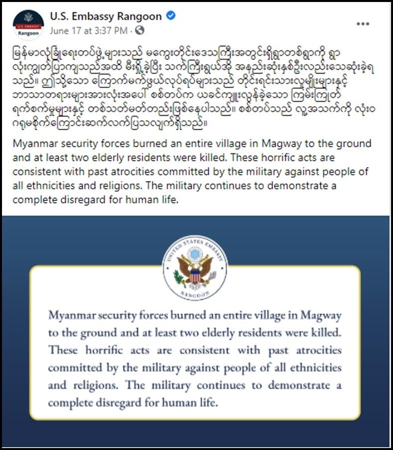 သို့ဖြစ်၍ NLD အမာခံများပါဝင်သည့် အကြမ်းဖက် PDF အဖွဲ့အနေဖြင့် အကြမ်းဖက် NUG ၏ ကြိုးကိုင်မှုဖြင့် ကမ္ဘာကုလသမဂ္ဂတွင် ဇွန် ၁၈ ရက်တွင် ကျင်းပပြုလုပ်ခဲ့သည့် ကုလသမဂ္ဂ အထွေထွေညီလာခံကျင်းပချိန်၊ ကုလသမဂ္ဂ လုံခြုံရေးကောင်စီ၏ တံခါးပိတ်အစည်းအဝေး ကျင်းပချိန်တို့နှင့် အချိန်ကိုက်၍ နိုင်ငံတော်အစိုးရပုံရိပ်ကို ထိခိုက်ရန်နှင့် နိုင်ငံတကာ၏ ဖိအားပေးမှု ဖြစ်ပေါ်စေရန် အကြံဖြင့် အပြစ်မဲ့ကျေးရွာများအား မီးရှို့အကြမ်းဖက်နေသကဲ့သို့ ထင်မြင်လာ စေရန် ပြုလုပ်ခြင်းဖြစ်သည်။