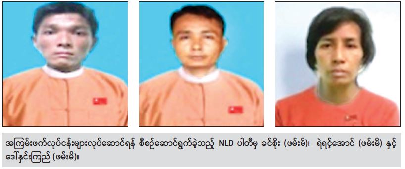 ဖမ်းဆီးရမိတရားခံများ၏ ဖော်ထုတ်ချက်များအရ အကြမ်းဖက်လုပ်ငန်း များအား တရားမဝင်ဖွဲ့စည်းထားသော အကြမ်းဖက်အဖွဲ့အစည်းဖြစ်သည့် CRPH နှင့် NUG အဖွဲ့ဝင် ရည်မွန်မှ ဦးဆောင်၍ ပြည်တွင်းရှိ NLD ပါတီဝင် သိန်းနိုင်၊ ညီညီ၊ မျိုးဇော်အောင်၊ ကျော်စိုးလင်း၊ ခင်မောင်မြင့်၊ မောင်ဒီ၊ ခင်စိုး၊ ရဲရင့်အောင်၊ ဒေါ်နှင်းကြည် တို့နှင့် ပူးပေါင်းဆောင်ရွက်ခဲ့ခြင်းဖြစ်ကြောင်း သိရှိရပါသည်။