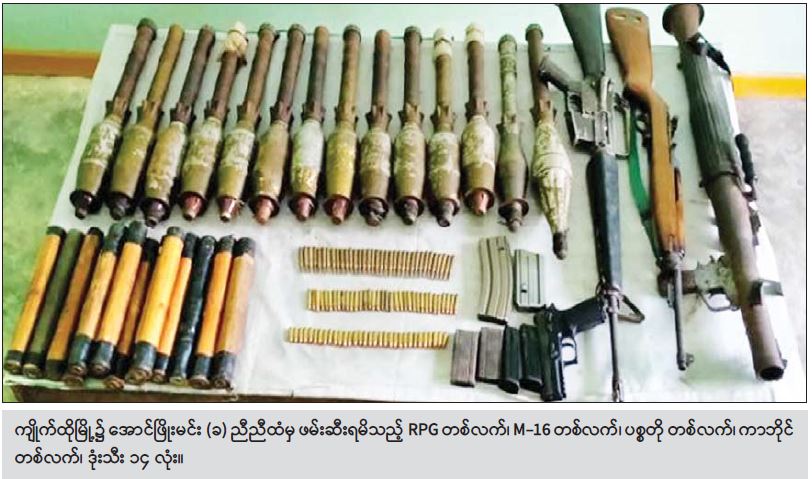 အထက်ပါဖြစ်စဉ်များတွင် ခင်ကျော်(UNRA)နှင့် ကိုကိုနိုင်(ခ)ဒေါန အပါအဝင် အကြမ်းဖက်လုပ်ရပ်များတွင် ပါဝင်ပတ်သက်သူ တရားခံ ၁၇၃ ဦးအား လက်နက်မျိုးစုံ ၁၃၁ လက်၊ လက်လုပ်သေနတ် ၃၇ လက်၊ လက်ပစ်ဗုံး ၅၅၉ လုံး၊ လက်လုပ်ဗုံး ၂၂၅၁ လုံး၊ ၄၀ မမဗုံးသီး ၁၄၇၃ လုံး၊ RPG ဒုံးသီး ၁၄ လုံး၊ ရှေ့ထွက်မိုင်း ၁ လုံး၊ ကျည်အိမ် ၂၆၉ ခု၊ ကျည်မျိုးစုံ ၁၀၅၁၅ တောင့်နှင့် ဆက်စပ်ပစ္စည်းများအား ဖမ်းဆီးရမိခဲ့ပါသည်။