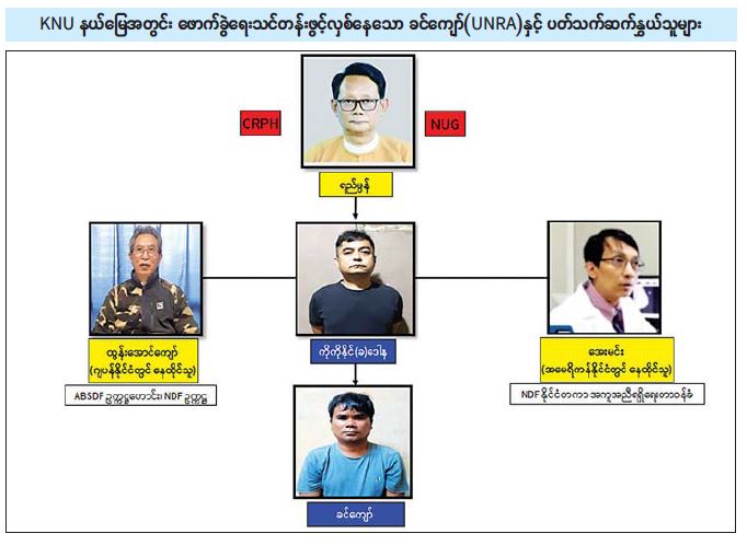 တရားခံ ခင်ကျော်သည် ၁၉၈၈ ခုနှစ်တွင် ABSDF သို့ဝင်ရောက်ခဲ့ပြီး ၂၀၁၄ ခုနှစ်တွင် ABSDF မှ ခွဲထွက်၍ အဖွဲ့ဝင် ၇ ဦးဖြင့် UNRA အား ဖာပွန်မြို့နယ်၊ လဲဝါကျေးရွာ၌ ဖွဲ့စည်းခဲ့ကြောင်း၊ ၂၀၂၁ ခုနှစ်၊ မတ်လမှစတင်၍ ဖောက်ခွဲရေး သင်တန်းများအား ဖွင့်လှစ်ခဲ့ပြီး တရားမဝင်အဖွဲ့အစည်းဖြစ်သည့် NUG မှ ခေါင်းဆောင် များနှင့် ချိတ်ဆက်ဆောင်ရွက်လျက်ရှိသူဖြစ်ကြောင်း သိရှိရသည်။