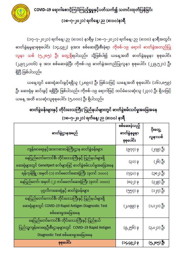 COVID-19 ရောဂါစောင့်ကြပ်ကြည့်ရှုမှုနှင့်ပတ်သက်၍ သတင်းထုတ်ပြန်ခြင်း (၁၈-၇-၂၀၂၁) ရက်နေ့၊ ည (၈:၀၀)နာရီ 07/18/2021