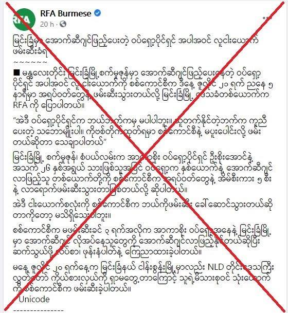 မြင်းခြံမြို့နယ် စက်မှုဇုန်ရှိ အောက်ဆီဂျင်ဖြည့်ပေးနေသော ဝပ်ရှော့ပိုင်ရှင် အပါအဝင် လူခြောက်ဦးကို လုံခြုံရေးတပ်ဖွဲ့ဝင်များက အရပ်ဝတ်များဖြင့် လာရောက်ဖမ်းဆီးသွားသည့် သတင်းအား RFA က ဖြစ်စဉ် အမှန်စိစစ်ခြင်း မရှိဘဲ ကျင့်ဝတ်မဲ့စွာ ထုတ်ပြန်ထား ကြောင်းသိရသည်။