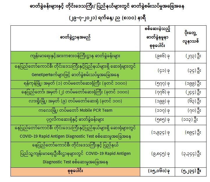 (၂၈-၇-၂၀၂၁) ရက်နေ့၊ ည (၈:၀၀)နာရီမှ (၂၉-၇-၂၀၂၁) ရက်နေ့၊ ည (၈:၀၀) နာရီအတွင်း ဓာတ်ခွဲနမူနာစုစုပေါင်း (၁၅,၀၆၀) ခုအား စစ်ဆေးပြီးစီးခဲ့ရာ COVID-19 ရောဂါ ဓာတ်ခွဲ အတည်ပြုလူနာသစ် (၅,၂၃၄) ဦးတွေ့ရှိရပါသည်။ သို့ဖြစ်ပါ၍ ယနေ့အထိ ဓာတ်ခွဲနမူနာ စုစုပေါင်း (၃,၁၃၁,၅၁၁) ခုအား စစ်ဆေးခဲ့ပြီး COVID-19 ဓာတ်ခွဲအတည်ပြုလူနာ စုစုပေါင်း (၂၈၉,၃၃၃) ဦး ရှိပြီ ဖြစ်ပါသည်။