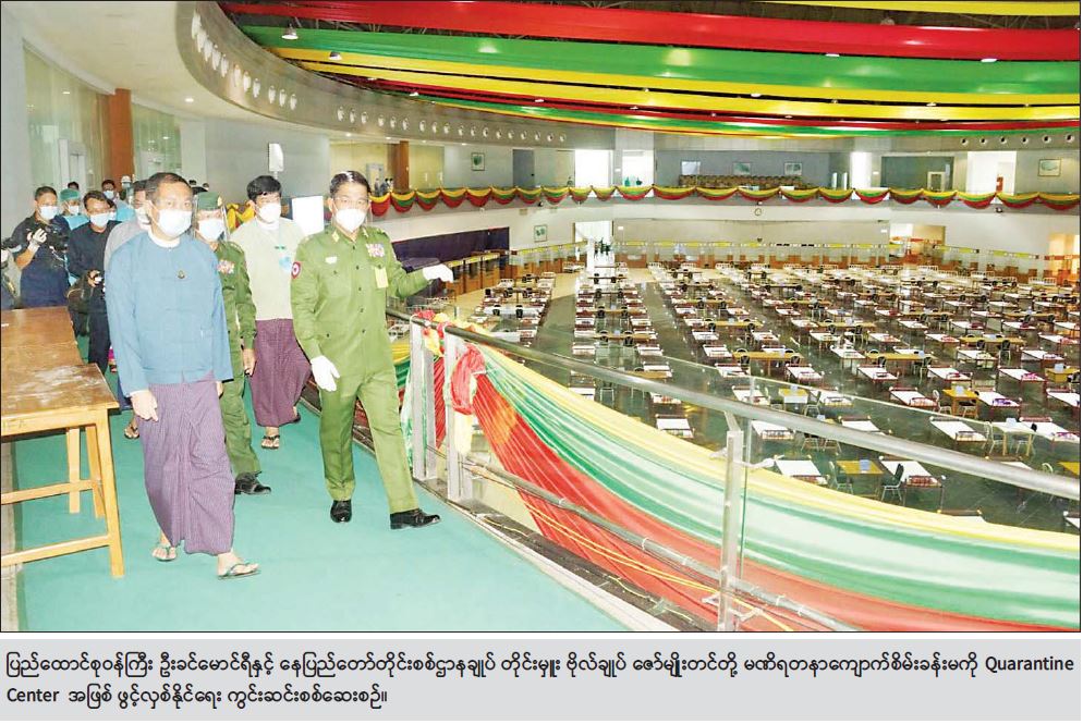 Positive Center အဖြစ် မဏိရတနာ ကျောက်စိမ်းခန်းမ၊ စည်ပင်ဧည့်ရိပ်သာ (၁)နှင့် (၂)၊ လယ်ဝေးမြို့နယ် မြို့နယ်အားကစားရုံတွင်လည်းကောင်း Contact Person Quarantine အား ပျဉ်းမနားမြို့နယ် မင်္ဂလာဗျူဟာ သာသနာ့ဗိမာန် တွင်လည်းကောင်း၊ Stay at Home မြို့နယ်မှ လာရောက်သူများအား အမှတ်(၃)စစ်ကြောရေးနှင့် တည်းခိုရေးစခန်း (ရွာတော်)တွင် လည်းကောင်း၊ Facility Quarantine Center 308 400:0p ဟိုတယ်နှင့် ဇမ္ဗူသီရိဟိုတယ်၊ Jade City ဟိုတယ် (အခမဲ့)၊ ဟိုတယ်ရွှေပြည်တော် တို့တွင်လည်းကောင်း ထားရှိကုသနိုင်ရေး ဆောင်ရွက်ပေးလျက် ရှိပါသည်။
