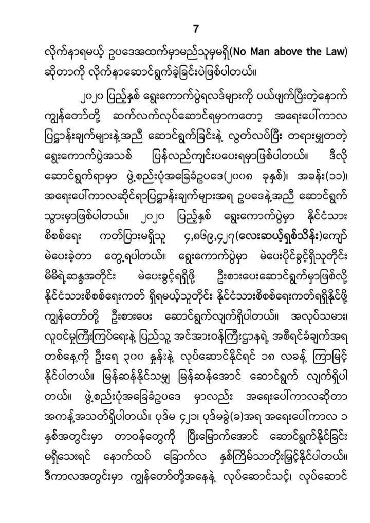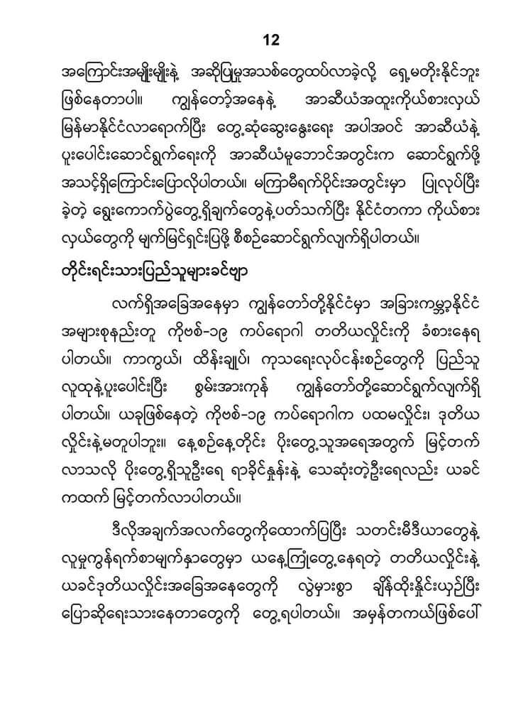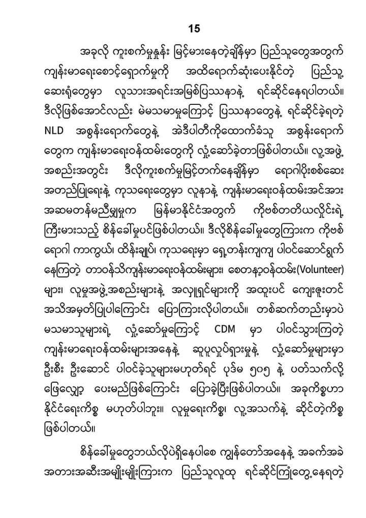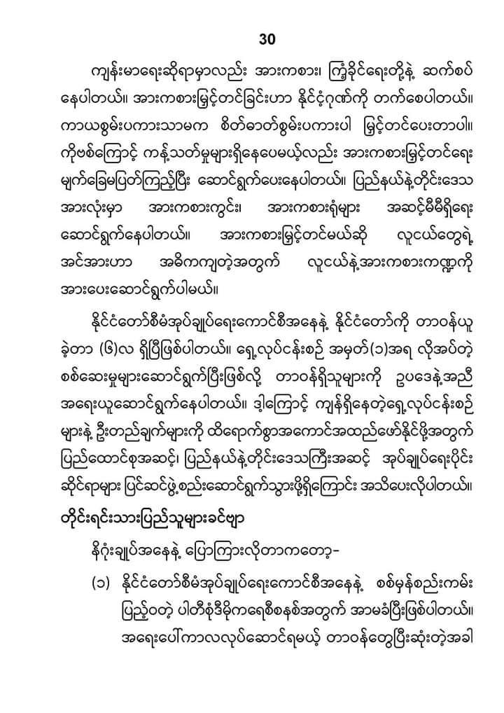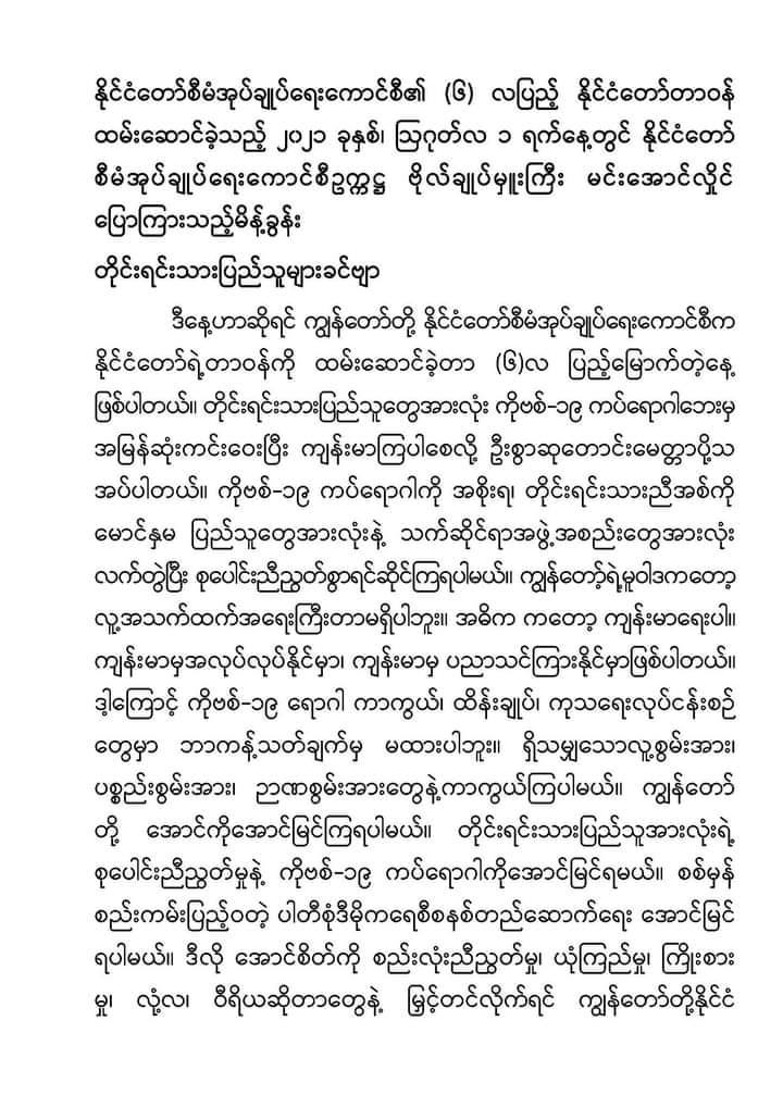 နိုင်ငံတော်စီမံအုပ်ချုပ်ရေးကောင်စီ၏ (၆) လပြည့် နိုင်ငံတော်တာဝန် ထမ်းဆောင်ခဲ့သည့် ၂၀၂၁ ခုနှစ်၊ သြဂုတ်လ ၁ ရက်နေ့တွင် နိုင်ငံတော် စီမံအုပ်ချုပ်ရေးကောင်စီဥက္ကဋ္ဌ ဗိုလ်ချုပ်မှူးကြီး မင်းအောင်လှိုင် ပြောကြားသည့်မိန့်ခွန်း
