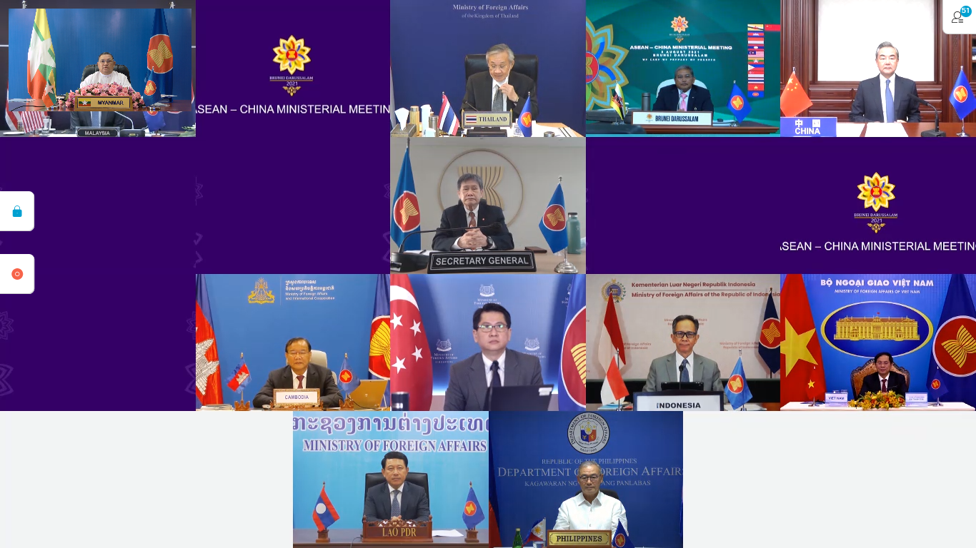 ဆက်လက်၍ အာဆီယံ-တရုတ် နိုင်ငံခြားရေးဝန်ကြီးများ အစည်းအဝေးကို တဆက် စပ်တည်း ကျင်းပခဲ့ရာ ဖိလစ်ပိုင်နိုင်ငံခြားရေးဝန်ကြီး H.E. Teodoro Locsin Jr နှင့် တရုတ် နိုင်ငံတော် ကောင်စီဝင်နှင့် နိုင်ငံခြားရေးဝန်ကြီး H.E. Wang Yi တို့က ပူးတွဲသဘာပတိ များအဖြစ် ဆောင်ရွက်ခဲ့ကြသည်။ အစည်းအဝေးတွင် နိုင်ငံခြားရေးဝန်ကြီးဌာန၊ ပြည်ထောင် စုဝန်ကြီးက အာဆီယံနှင့် တရုတ်ပြည်သူ့သမ္မတနိုင်ငံတို့အကြား အိမ်နီးချင်းကောင်း ဆက်ဆံ ရေး၊ အပြန်အလှန်ယုံကြည်မှု၊ ထောက်ပံ့မှုနှင့် အကျိုးဖြစ်ထွန်းစေမှုတို့ဖြင့် အာဆီယံ- တရုတ် ဆွေးနွေး ဖက်ဆက်ဆံရေး၏ နှစ်ပေါင်း (၃၀) ကျော်ခရီးတွင် စဉ်ဆက်မပြတ် တိုးတက် လျက်ရှိခြင်းကို ကျေနပ်အားရမှုရှိကြောင်း၊ အာဆီယံ-တရုတ် ဆွေးနွေးဖက် ဆက်ဆံရေး နှစ်ပတ်လည် အထိမ်းအမှတ် ထိပ်သီးအစည်းအဝေးကို ကြိုလင့်လျက် ၂၀၂၂ ခုနှစ်အတွက် ဆွေးနွေးဖက် ဆက်ဆံရေး၏ ဦးတည်ချက်ဆောင်ပုဒ်အဖြစ် "စဉ်ဆက်မပြတ် ဖွံ့ဖြိုးတိုးတက် ရေးပူးပေါင်း ဆောင်ရွက်မှု" (Sustainable Development Cooperation) ကို ဆက်လက် ဖော်ဆောင်ရန် တရုတ်နိုင်ငံ၏ အဆိုပြုချက်ကိုလည်း ကြိုဆိုကြောင်း၊ ကိုဗစ်-၁၉ အာဆီယံ တုန့်ပြန်ရေး ရန်ပုံငွေနှင့် ပြည်သူ့ကျန်းမာရေး အရေးပေါ် အခြေအနေဆိုင်ရာ စီမံကိန်းများ အတွက် အာဆီယံ-တရုတ် ပူးပေါင်းဆောင်ရွက်ရေး ရန်ပုံငွေတို့တွင် တရုတ်နိုင်ငံမှ ထောက်ပံ့ မှုများကို ကျေးဇူးတင်ရှိကြောင်း၊ တရုတ်နိုင်ငံမှ ကိုဗစ်-၁၉ ကာကွယ်ဆေးများနှင့် ဆက်စပ် ဆေးပစ္စည်းအထောက်အပံ့များ လှူဒါန်းခြင်း အတွက်လည်း ကျေးဇူးတင်ရှိကြောင်း ဆွေးနွေး ပြောကြားသည်။