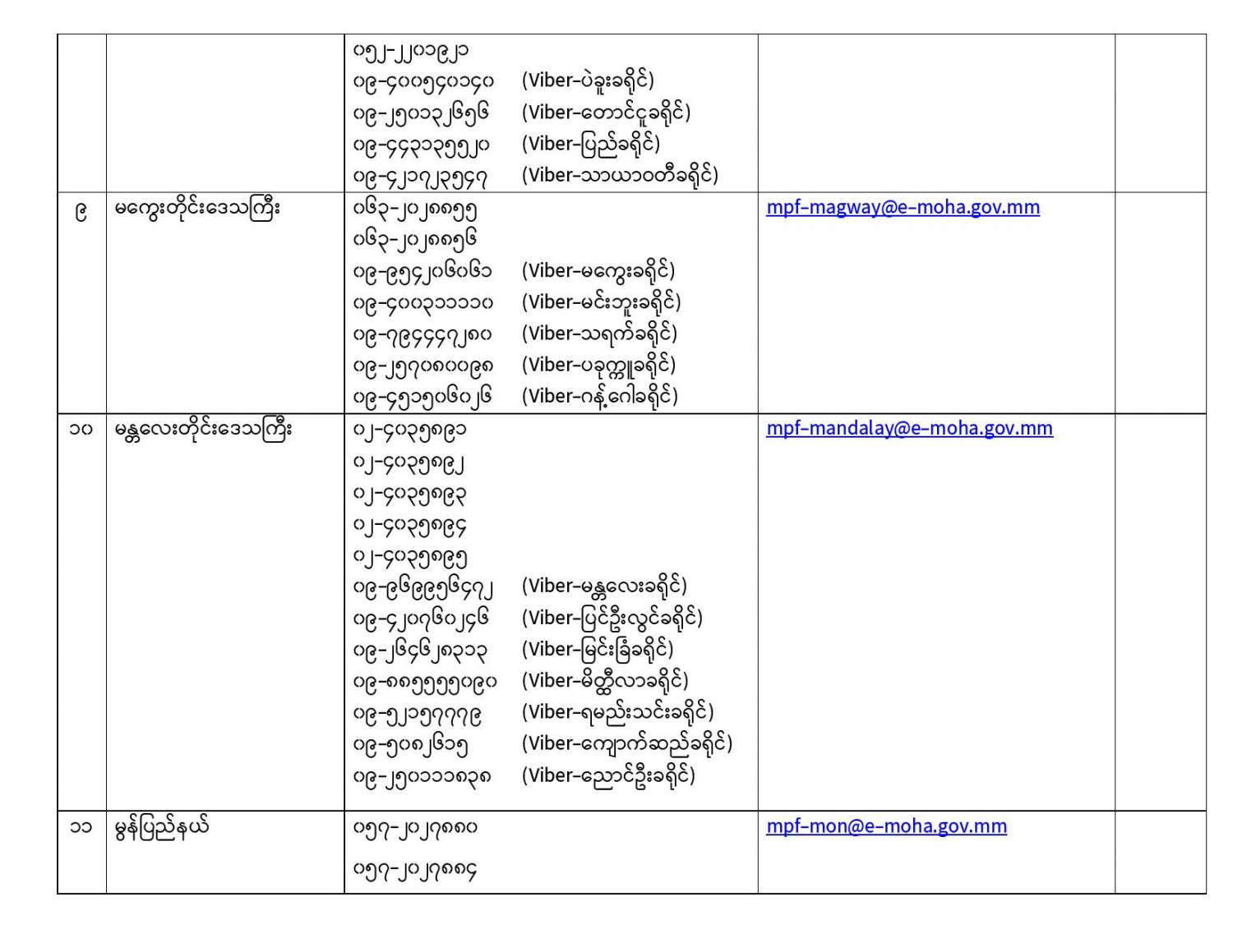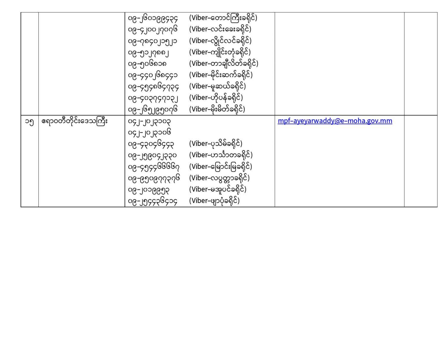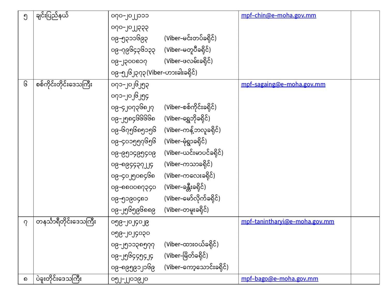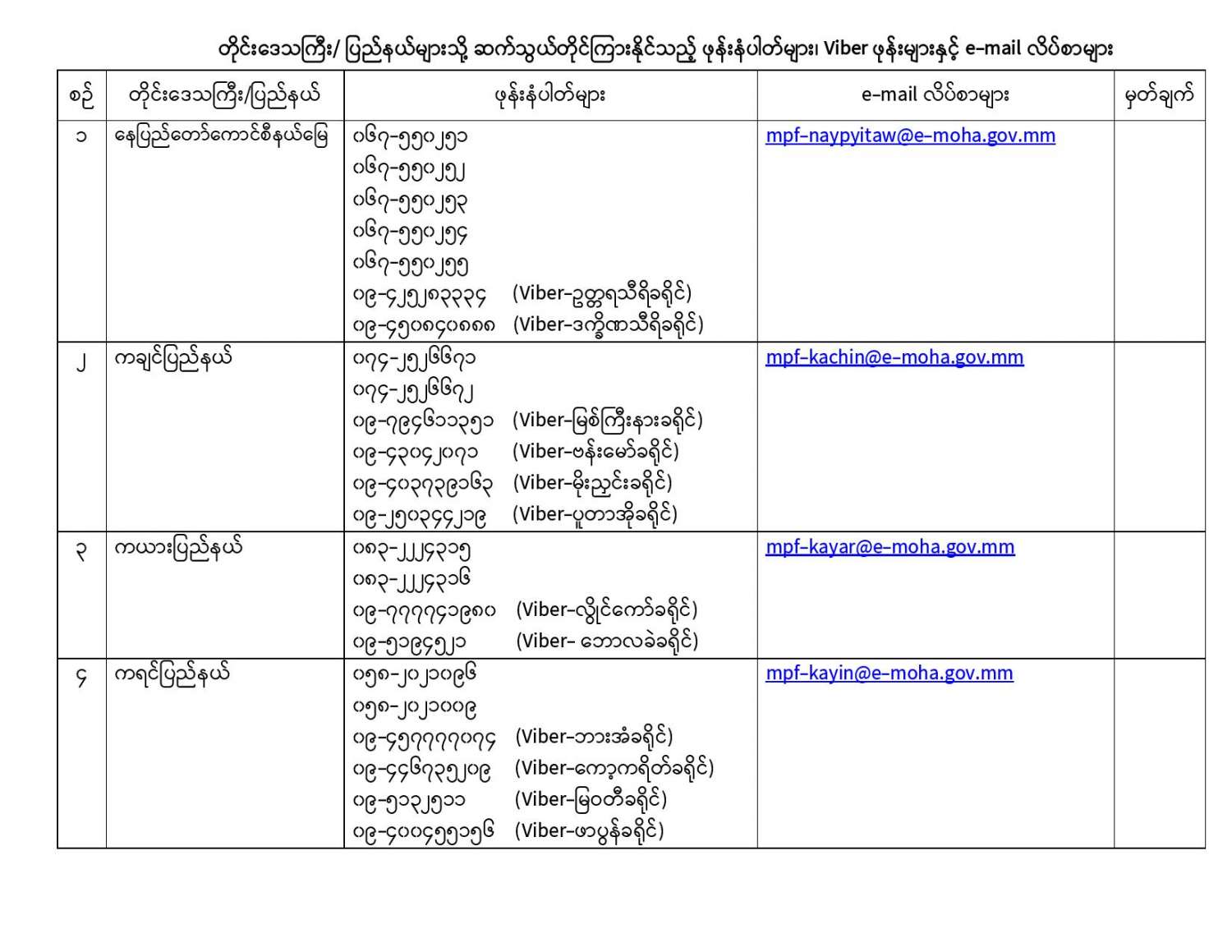 ယခုကာလအတွင်း လူသတ်မှု၊ လုယက်မှု၊ မီးရှို့မှု၊ မိုင်းဖောက်ခွဲမှု၊ လုံခြုံရေးတပ်ဖွဲ့ဝင်များအား ရည်ရွယ်ချက်ရှိရှိ တိုက်ခိုက်မှု၊ ပြည်သူ့ဝန်ထမ်းများနှင့် ပြည်သူအချို့အား အုပ်စုဖွဲ့ ကိုယ်ထိလက်ရောက် တိုက်ခိုက်မှု၊ အစိုးရပိုင်အဆောက်အဦများနှင့် ပုဂ္ဂလိကပိုင် အဆောက်အဦများအား ဖျက်ဆီးမှု၊ (CDM) လှုပ်ရှားမှုတွင် ငွေကြေးအရဖြစ်စေ၊ အခြားနည်းလမ်းဖြစ်ဖြင့်စေ၊ နက်ရှိုင်းစွာကာယကံမြောက် ပါဝင်သူများမှအပ စိုးရိမ်စိတ်ကြောင့် ထွက်ပြေးတိမ်းရှောင်နေကြသည့် ဝန်ထမ်းများ၊ အသိပညာရှင်၊ အတတ်ပညာရှင်များ၊ အခြားနယ်ပယ်အသီးသီးမှ ပုဂ္ဂိုလ်များ၊ နိုင်ငံသားများ အနေဖြင့် ဥပဒေဘောင်အတွင်း ပြန်လည်ဝင်ရောက်မည်ဆိုပါက ၎င်းတို့အပေါ် ရေးဖွင့်ထားသည့် အမှုများကို ဥပဒေနှင့်အညီ ပိတ်သိမ်းခြင်း၊ ရုပ်သိမ်းခြင်းများ ဆောင်ရွက်ပေးမည်ဖြစ်သဖြင့် အောက်တွင် ဖော်ပြထားသည့် ဖုန်းနံပါတ်များသို့ ယုံကြည်စိတ်ချစွာဖြင့် ဆက်သွယ်နိုင်ပါသည်။