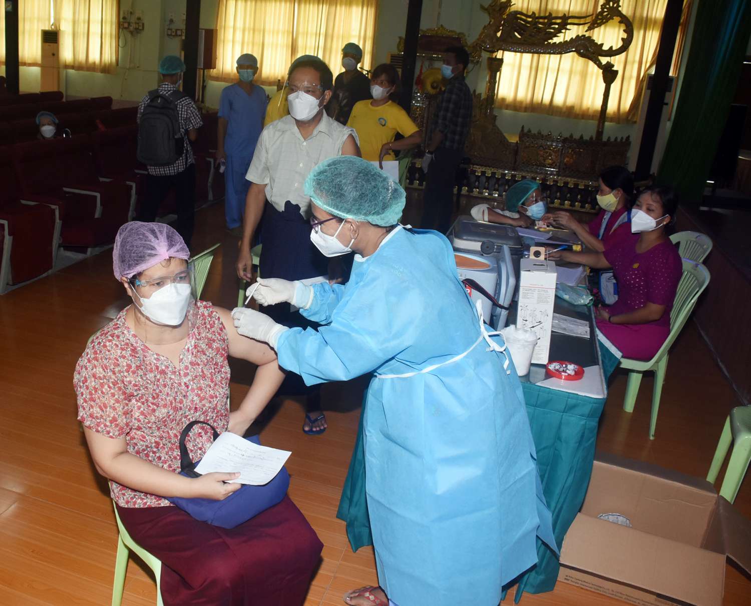 မြန်မာနိုင်ငံသဘင်အစည်းအရုံးမှ သဘင်ပညာရှင် အဖိုး/အဖွားများနှင့် တာဝန်ထမ်းဆောင်ဆဲ အဖွဲ့ဝင်များကို ယနေ့နံနက် ၁ဝ နာရီတွင် ရန်ကုန်တိုင်းဒေသကြီး၊ ဒဂုံမြို့သစ် (တောင်ပိုင်း) မြို့နယ်ရှိ အမျိုးသားယဉ်ကျေးမှုနှင့် အနုပညာတက္ကသိုလ် (ရန်ကုန်)တွင် ကျန်းမာရေးဝန်ကြီးဌာနမှ ကျန်းမာရေးဝန်ထမ်း ဆရာဝန်/ ဆ‌ရာမများက  ကိုဗစ်-၁၉ ကာကွယ်ဆေးထိုးနှံ ဆောင်ရွက် ပေးသည်။